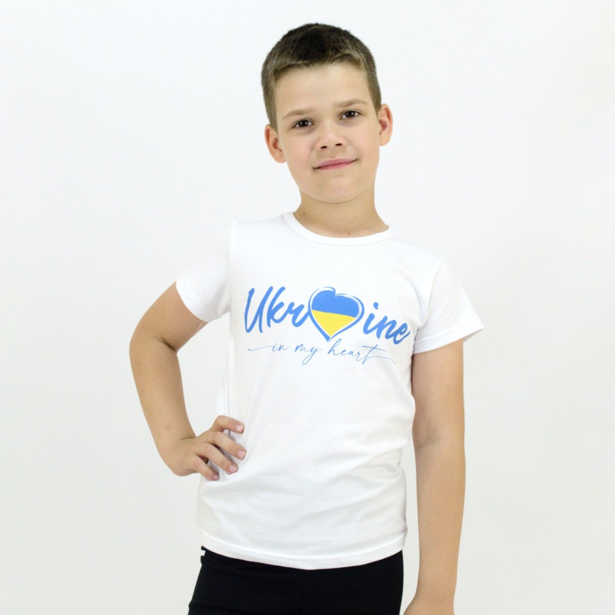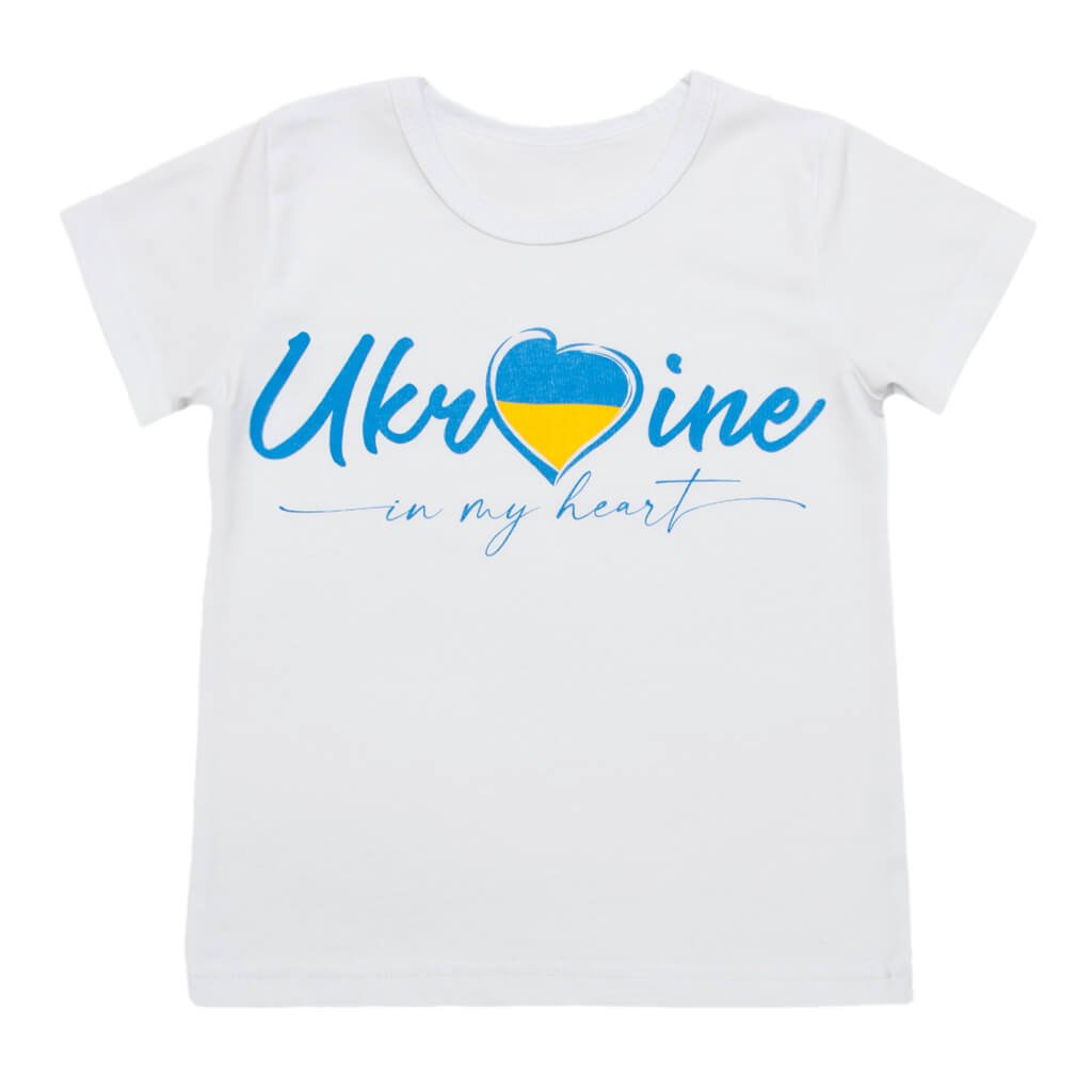 Футболку можна назвати однією з найпопулярніших речей у гардеробі кожної людини. У нашому інтернет-магазині «Арлекин» представлений великий вибір дитячих футболок найвищої якості, до того ж за дуже приємною ціною. Дана модель дитячої футболки виготовлена із якісного трикотажного матеріалу, білого кольору з написом Ukraine in my heart. Тканина неймовірно м'яка та приємна до тіла, не викликає алергії та подразнення на шкірі дитини. Крім цього, полотно легко переносить численні прання. На лицьовій стороні футболки є яскраве та красиве зображення. Така футболка точно сподобається Вашому малюкові!