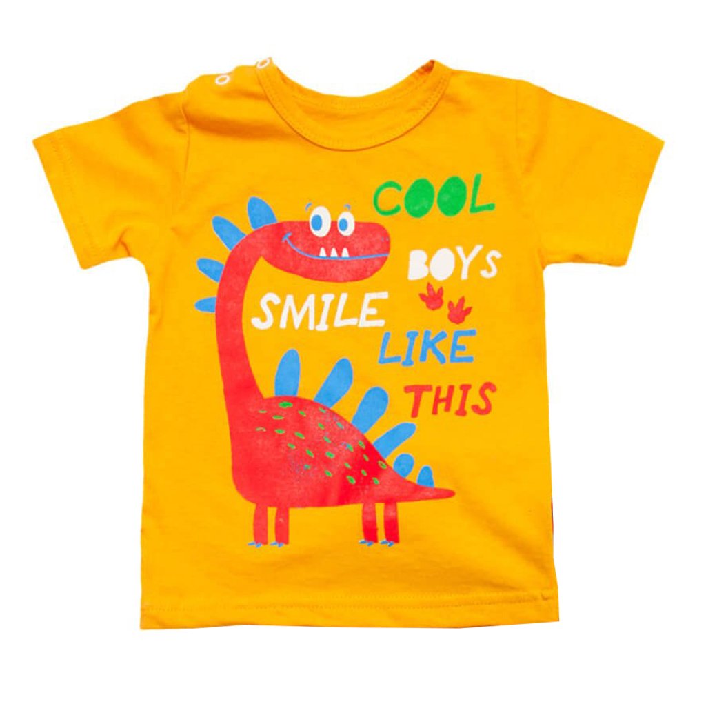 Футболочка для хлопченят. Футболка виконана з легкого і якісного матеріалу – «кулір». Така футболка гірчичного кольору з покраскою динозавр стане незамінною річчю в гардеробі вашої дитини. Футболку цієї моделі ви зможете поєднувати з різними штанцями, трессиками і так далі. Однотонна футболка йде в різних забарвленнях і з різними цікавими малюнками і написами. На одному плечику застібка на кнопці, для зручнішого одягання і зняття виробу. Таку модель футболки Ви з легкістю зможете замовити на нашому сайті інтернет-магазину «Арлекін». Наша торгова марка дарує гарний настрій своїм маленьким клієнтам.