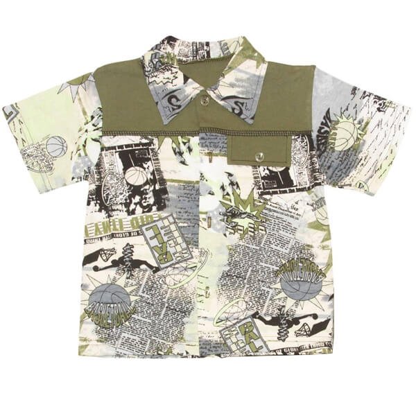 Однотонний батнік для хлопчика, скомбінований й відшитий з двох тонів інтерлочного полотна: світлого і темного. Розрахований на теплу весну або прохолодне літо. Полотно добре тримає форму, навіть при регулярному пранні не деформується. Носити можна у поєднанні з шортиками або брюками. Манжет на короткому рукавці і відкладний комірець з полотна, темнішого тону. Передня й задня полички з полотна тоном світліше. Низ батнічка під розпошив з розкладальником, виповнений за допомогою контрастної кольорової нитки в колір комірця. Спереду горловини кнопочки-застібки.