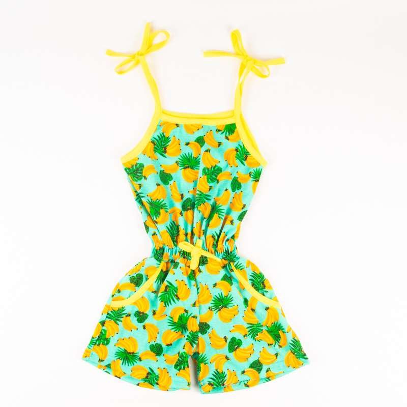 Літні комбінезони - це відмінне рішення при виборі дитячого одягу для жаркої пори року. До вашої уваги представлена неймовірна новинка нашого інтернет-магазину «Арлекин». Літній комбінезон для дівчинки виготовлений із трикотажного кулірного полотна. Тканина дуже м'яка та приємна на дотик, завдяки цьому в такому комбінезоні Ваша дитина почуватиметься вільно та легко. По всій бірюзовій тканині є яскраві малюнки бананів. Доповнюють представлений комбінезон невеликі кишеньки та зав'язочки, які розташовані на поясі та плічках.