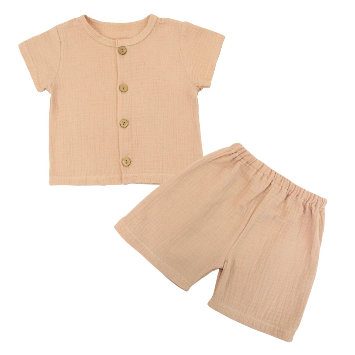 Для теплих днів ідеально підходить комплект з мусліну бежевого кольору, який забезпечить вашому малюкові комфорт і стиль. Сорочка з ґудзиками і вільним кроєм дарує повну свободу рухів, даючи змогу шкірі дихати в спекотну погоду. М'який і легкий муслін, завдяки своїм натуральним властивостям, ніжно торкається шкіри, не викликаючи подразнень. Однотонний дизайн додає простоти, в той час як шорти з еластичним поясом ідеально сидять, не обмежуючи активність дитини. Такий комплект стане чудовим вибором для веселих і активних літніх днів.