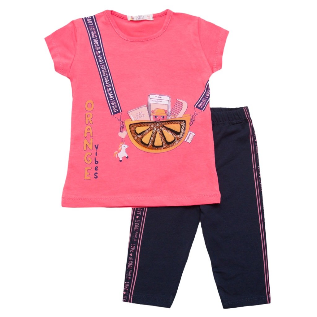 Влітку дітки часто ведуть активний спосіб життя і для цього потрібна якісний і зручний одяг. Якраз в нашому інтернет-магазині, Ви зможете знайти все, що необхідно Вашим діткам. Літній костюм для дівчинки складається з футболки та лосин, і пошитий з якісної фулікри - це гарне полотно, яке відмінно тримає свою форму. На футболочці є яскравий принт, такий цікавий малюнок те, що треба для літніх днів. Лосини добре сидітимуть на малятку за допомогою резинки. Також з боків на лосинах є вставки з написами, виглядає дуже стильно і сучасно.