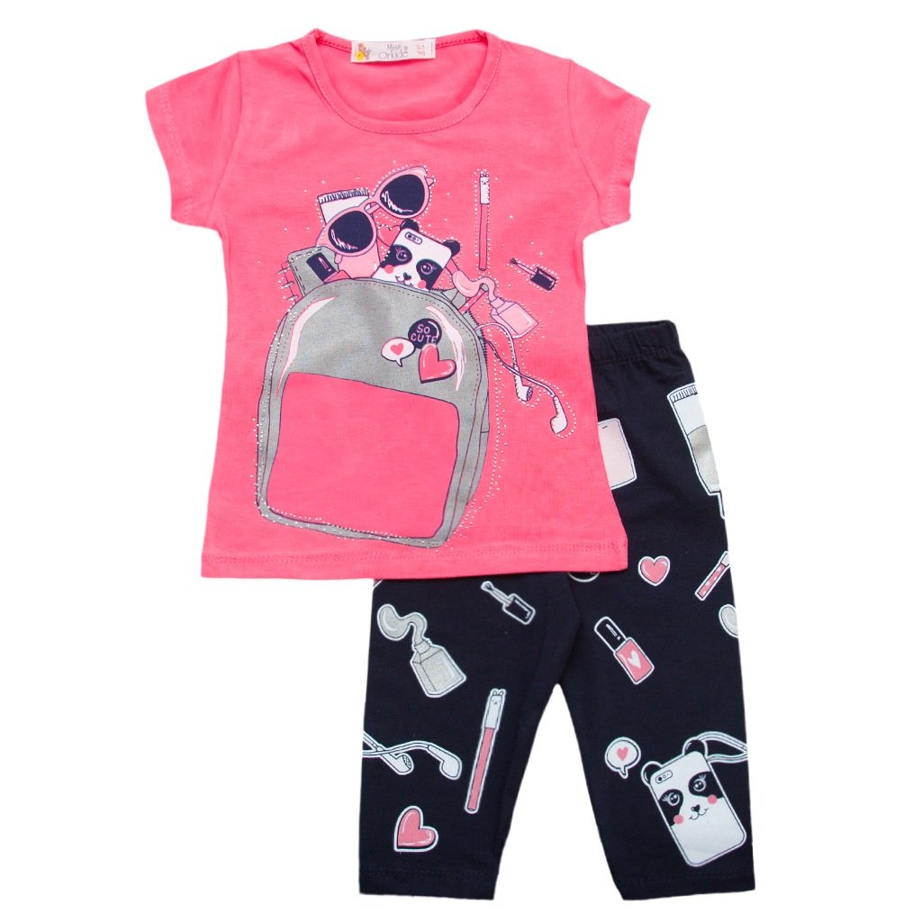 Наш інтернет-магазин «Арлекін» - це великий асортимент якісношо й стильного дитячого одягу. Все необхідне для Вашої дитини, Ви можете придбати на нашому сайті. Ми з радістю представляємо Вам новий літній персиковий комплект для дівчинки. Складається він з футболки і лосин. Якісні полотна забезпечать комфорт Вашій маленькій красуні. Спереду на футболці зображені дуже красиві і модні малюнки. Лосини виконані з тканини з візерунками, виглядає досить оригінально. Такий комплект прекрасний варіант для маленьких модниць на літній період.