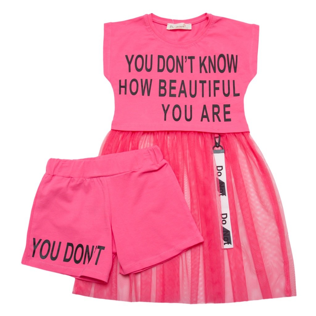Кожна матуся хоче, що б її донечка була справжнісінькою принцесою. З нашим інтернет-магазином «Арлекин» можливо все! У кожної маленької принцеси повинно бути гарненьке і стильне платтячко. Якраз на нашому сайті з'явилася неймовірна новинка. Рожева сукня для дівчинки дуже незвичайна, тому що в комплекті йдуть шортики, які потрібно надягати під фатіновой спідницю. Самі шорти і верх даної сукні виготовлені з якісного трикотажу. Спереду на сукні, як і на шортиках, є фарбування, такий дизайн виглядає досить незвично і сучасно.