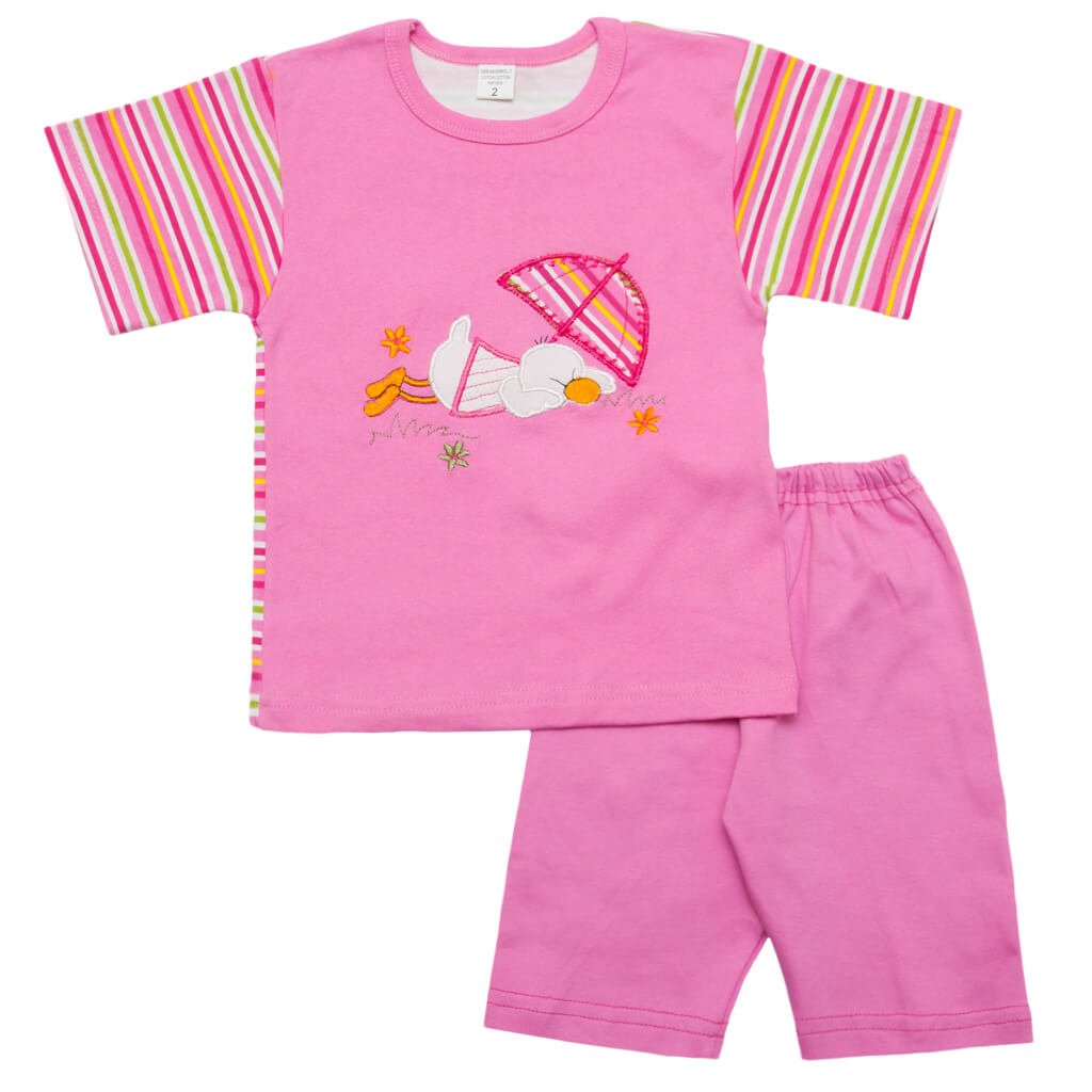 Літній комплект пошитий із високоякісного інтерлоку - ідеальний варіант на теплу погоду для вашого малюка. Комплект складається з футболочки та тресу. Полотно інтерлок повністю складається з натуральної та екологічно чистої бавовни, і завдяки цьому, вироби абсолютно безпечні для чутливої дитячої шкіри. Також інтерлок дуже м'який та приємний на дотик. Футболочка виконана з двох кольорів полотна, а прикрашає виріб мила нашивка на передній частині. Однотонні треси на м'якій резиночці відмінно сядуть на Вашому карапузі.