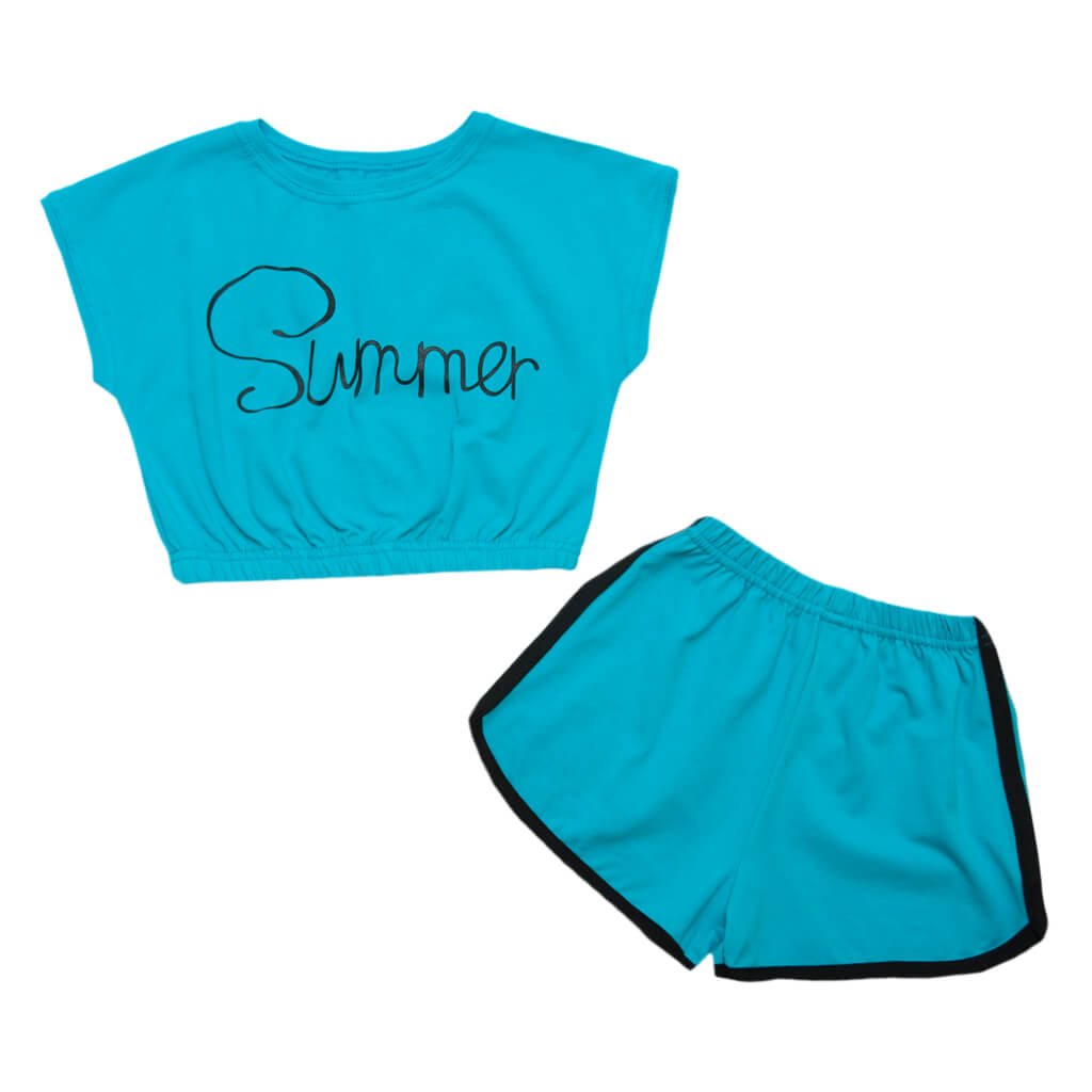 Стильна новинка нашого інтернет-магазину "Арлекин", яка точно сподобається маленьким модницям. Представлений комплект на літо для дівчинки складається з футболки та шортів бірюзового кольору. Вироби виготовлені з високоякісної тканини - стрейч-куліра. Такий матеріал має гарну еластичність, завдяки чому, комплект забезпечить комфорт і повну свободу рухів. Укорочена футболочка доповнена стильним написом, а по низу виробу присутня резинка. Дитячий комплект футболки та шортів ідеально підходить для ігор на відкритому повітрі, прогулянок, пікніків та інших активностей.