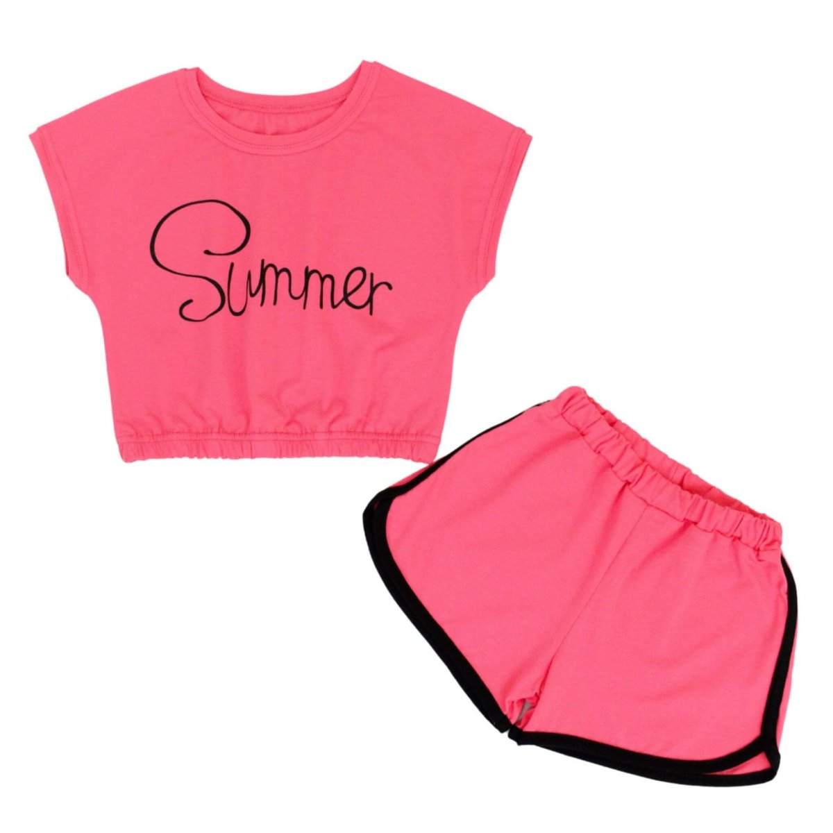 Стильна новинка нашого інтернет-магазину "Арлекин", яка точно сподобається маленьким модницям. Представлений комплект на літо для дівчинки складається з футболки та шортів коралового кольору. Вироби виготовлені з високоякісної тканини - стрейч-куліра. Такий матеріал має гарну еластичність, завдяки чому, комплект забезпечить комфорт і повну свободу рухів. Укорочена футболочка доповнена стильним написом, а по низу виробу присутня резинка. Дитячий комплект футболки та шортів ідеально підходить для ігор на відкритому повітрі, прогулянок, пікніків та інших активностей.