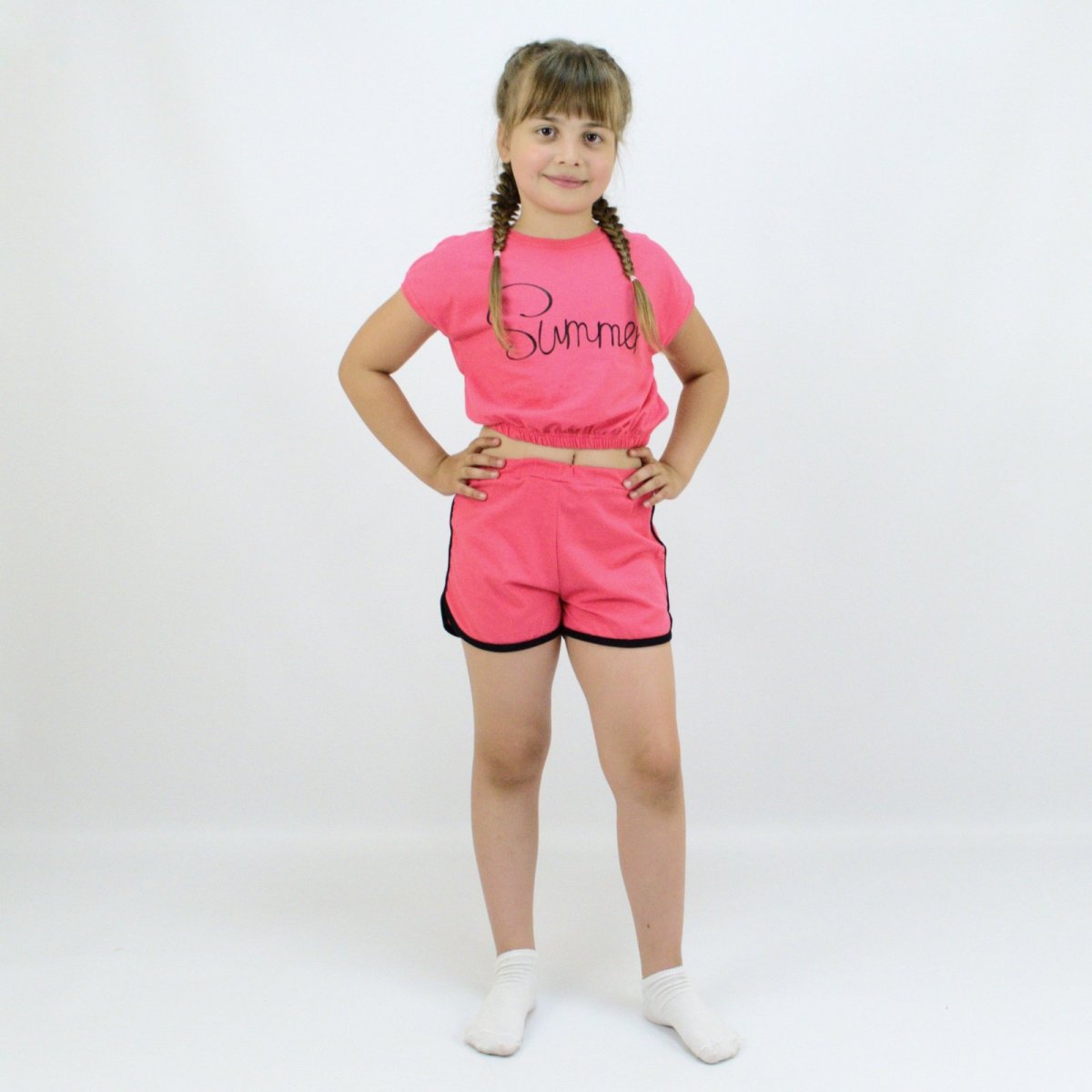 Стильна новинка нашого інтернет-магазину "Арлекин", яка точно сподобається маленьким модницям. Представлений комплект на літо для дівчинки складається з футболки та шортів коралового кольору. Вироби виготовлені з високоякісної тканини - стрейч-куліра. Такий матеріал має гарну еластичність, завдяки чому, комплект забезпечить комфорт і повну свободу рухів. Укорочена футболочка доповнена стильним написом, а по низу виробу присутня резинка. Дитячий комплект футболки та шортів ідеально підходить для ігор на відкритому повітрі, прогулянок, пікніків та інших активностей.