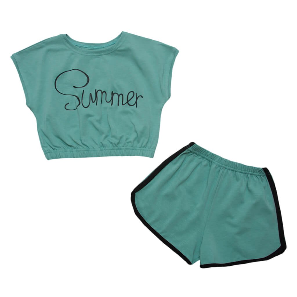 Стильна новинка нашого інтернет-магазину "Арлекин", яка точно сподобається маленьким модницям. Представлений комплект на літо для дівчинки складається з футболки та шортів м'ятного кольору. Вироби виготовлені з високоякісної тканини - стрейч-куліра. Такий матеріал має гарну еластичність, завдяки чому, комплект забезпечить комфорт і повну свободу рухів. Укорочена футболочка доповнена стильним написом, а по низу виробу присутня резинка. Дитячий комплект футболки та шортів ідеально підходить для ігор на відкритому повітрі, прогулянок, пікніків та інших активностей.