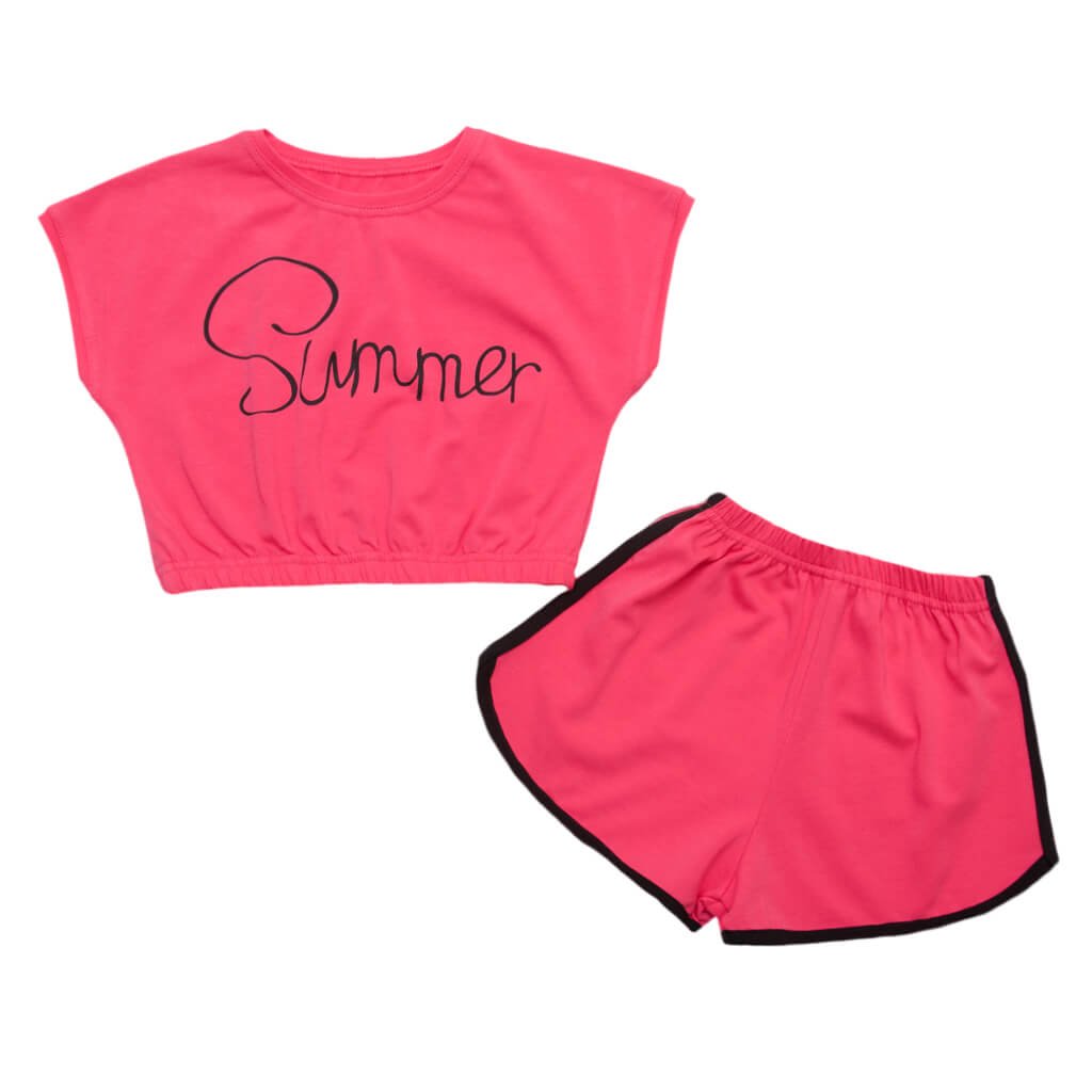 Стильна новинка нашого інтернет-магазину "Арлекин", яка точно сподобається маленьким модницям. Представлений комплект на літо для дівчинки складається з футболки та шортів темно-рожевого кольору. Вироби виготовлені з високоякісної тканини - стрейч-куліра. Такий матеріал має гарну еластичність, завдяки чому, комплект забезпечить комфорт і повну свободу рухів. Укорочена футболочка доповнена стильним написом, а по низу виробу присутня резинка. Дитячий комплект футболки та шортів ідеально підходить для ігор на відкритому повітрі, прогулянок, пікніків та інших активностей.