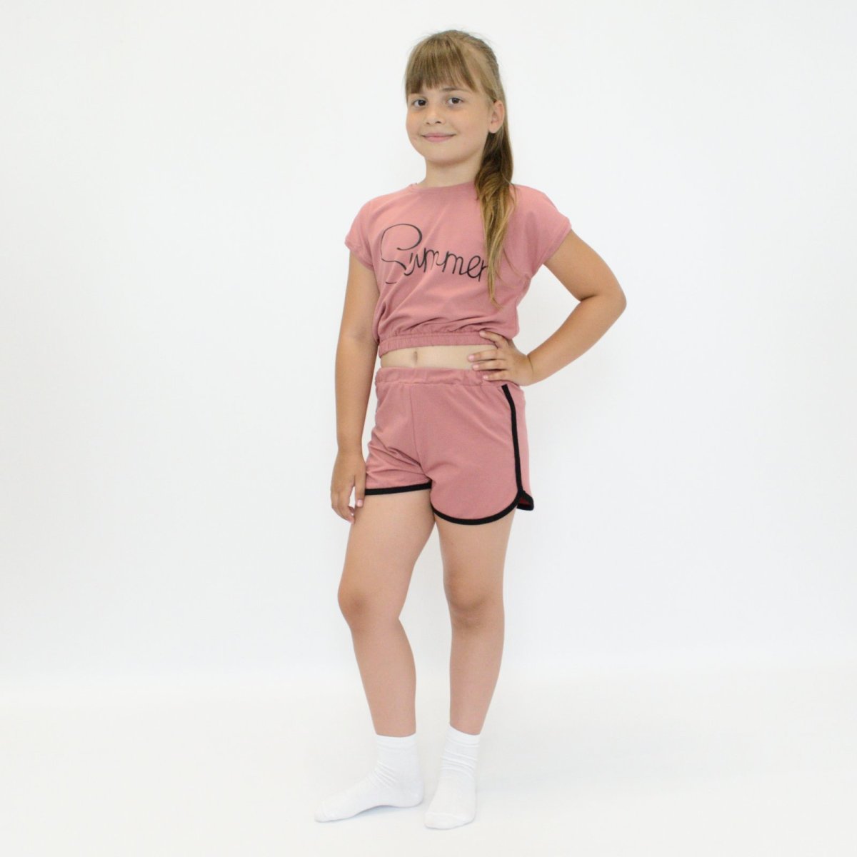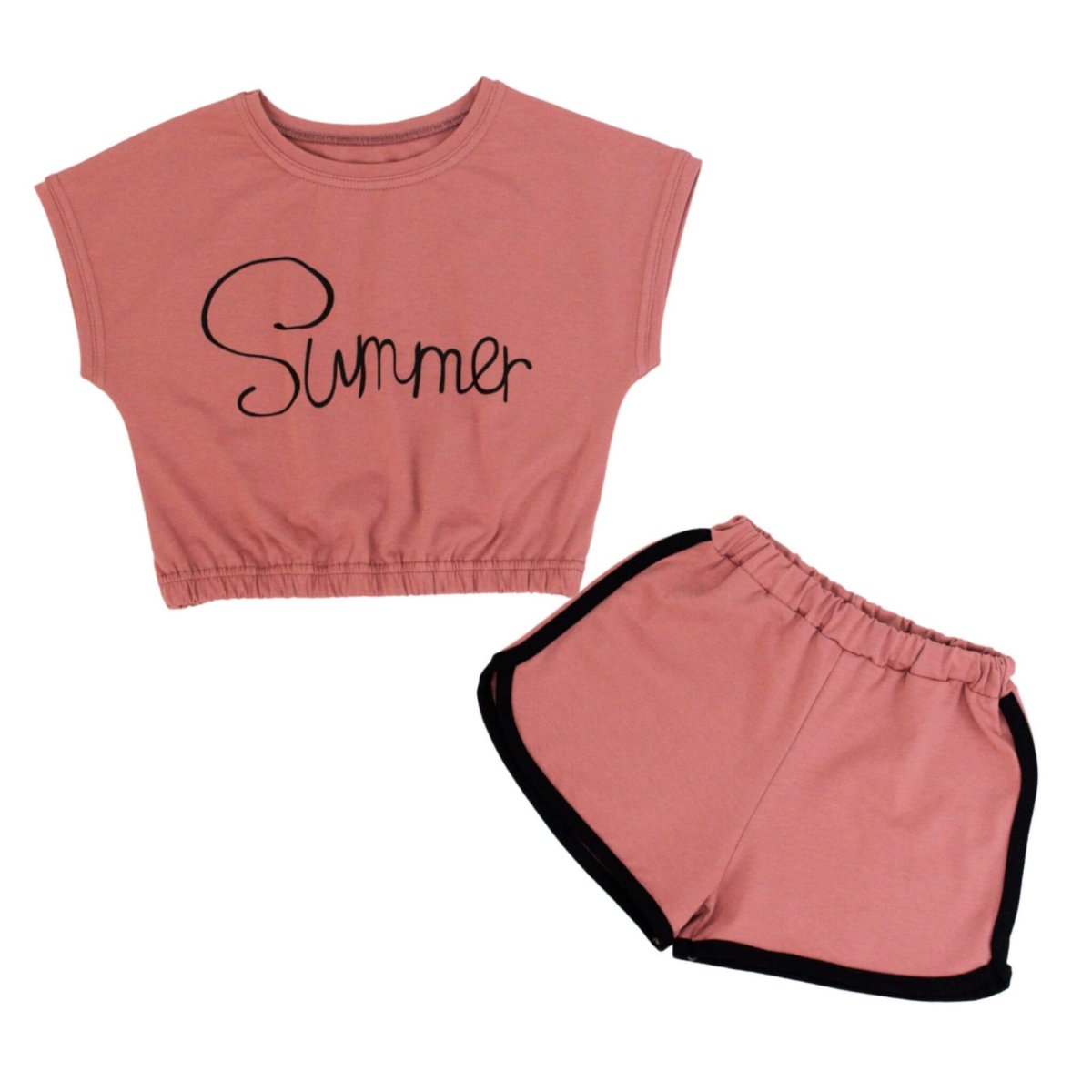Стильна новинка нашого інтернет-магазину "Арлекин", яка точно сподобається маленьким модницям. Представлений комплект на літо для дівчинки складається з футболки та шортів теракотового кольору. Вироби виготовлені з високоякісної тканини - стрейч-куліра. Такий матеріал має гарну еластичність, завдяки чому, комплект забезпечить комфорт і повну свободу рухів. Укорочена футболочка доповнена стильним написом, а по низу виробу присутня резинка. Дитячий комплект футболки та шортів ідеально підходить для ігор на відкритому повітрі, прогулянок, пікніків та інших активностей.