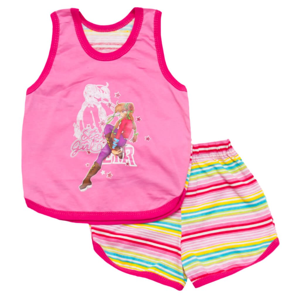 В асортименті нашого інтернет-магазину «Арлекин» Ви зможете знайти велику кількість літнього дитячого одягу. Новенькі модельки різних футболок, майок і шортиків для дівчаток вже готові до замовлення на нашому сайті. Літній комплект для дівчинки складається з майки і шортиків. Дані вироби виготовлені з високоякісного і гіпоалергенного куліра. Таке полотно прекрасно підходить для пошиття літнього одягу, так як тканина дуже м'яка і легка. Комплект виконаний в яскравих і барвистих кольорах. Спереду на майці присутнє цікаве фарбування.