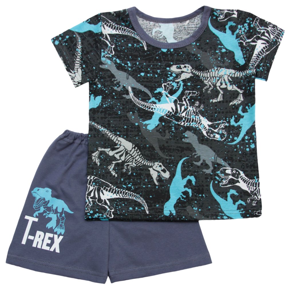 Новинка для Ваших діток від нашого інтернет-магазину "Арлекин". Комплект футболки і шортиків для хлопчика виготовлений з якісного трикотажного матеріалу - куліра. Це полотно ідеально підходить для виготовлення дитячого одягу на літо. Кулір тонкий та легкий, але водночас досить міцний. Футболочка пошита з полотна темно-сірого кольору з малюнком Динозавр, а шортики з однотонної тканини сірого кольору. Також шорти доповнені невеликим фарбуванням, яке відмінно поєднується з дизайном футболки. Такий дитячий комплект - ідеальний варіант для активного проведення часу в теплу пору року.