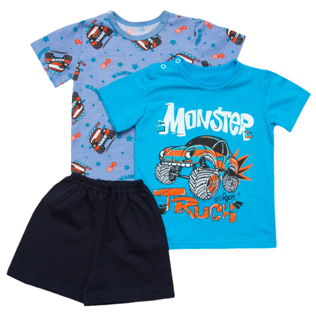 За вікном починається справжнє літо, тому ми радимо швидше підготуватися до нього з нашим інтернет-магазин «Арлекин». Неймовірні літні новинки вже чекають на Вас! Новий комплект для хлопчика складається з двох яскравих футболочек, бірюзового та блакитного кольору, і одних шорт. Вироби виготовлені з високоякісного бавовняного куліра. Дане полотно чудово підходить для виготовлення дитячої літнього одягу. На одному плечі однієї з футболок присутні кнопочки. Такий комплект виглядає дуже стильно і сучасно. Ми з нетерпінням чекаємо Ваше замовлення на нашому сайті!