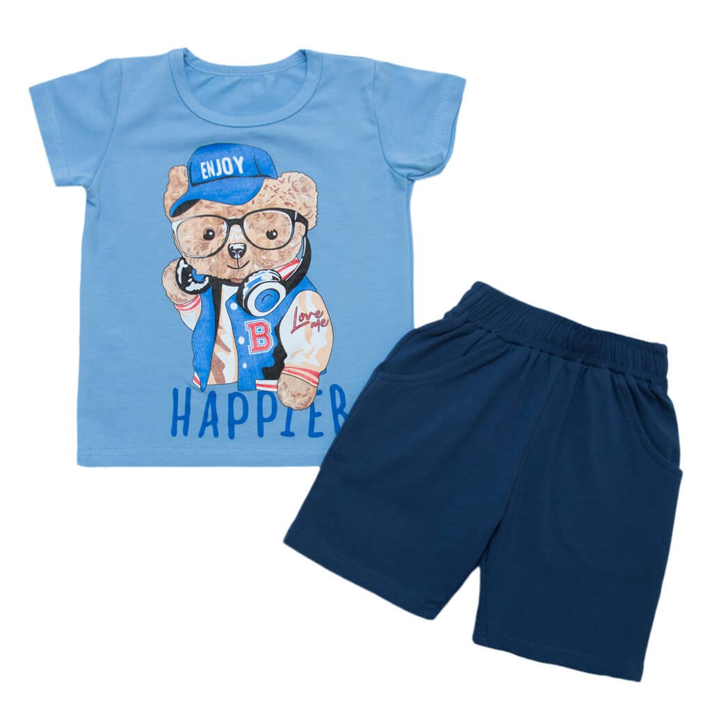Нова модель дитячого комплекту складається з футболочки блакитного кольору та шортиків кольору індиго. Вироби виготовлені з якісного еластичного матеріалу - стрейч-куліра. Футболка прикрашена стильним і яскравим принтом ведмедика на передній стороні, а шортики виконані в однотонному кольорі, що дасть змогу їх з легкістю поєднувати з іншими футболками та майками. Шортики виготовлені на м'якій резинці, завдяки якій виріб надійно зафіксується на тілі малюка. Також шорти доповнені невеликими кишеньками. Представлений комплект стане ідеальним варіантом для прогулянок на свіжому повітрі та активних ігор.