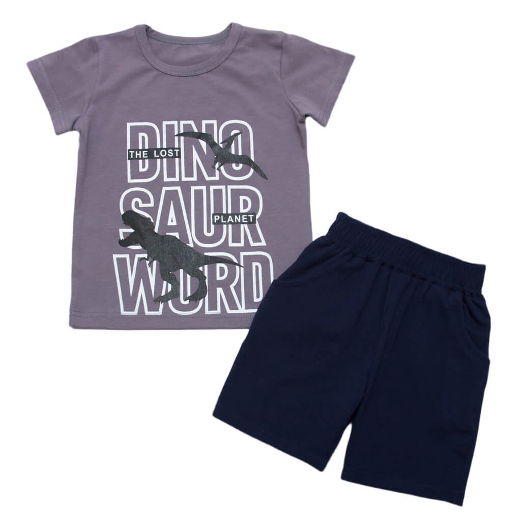 Нова модель дитячого комплекту складається з футболочки сірого кольору та шортиків темно-синього кольору. Вироби виготовлені з якісного еластичного матеріалу - стрейч-куліра. Футболка прикрашена стильним і яскравим принтом динозавра на передній стороні, а шортики виконані в однотонному кольорі, що дасть змогу їх з легкістю поєднувати з іншими футболками та майками. Шортики виготовлені на м'якій резинці, завдяки якій виріб надійно зафіксується на тілі малюка. Також шорти доповнені невеликими кишеньками. Представлений комплект стане ідеальним варіантом для прогулянок на свіжому повітрі та активних ігор.
