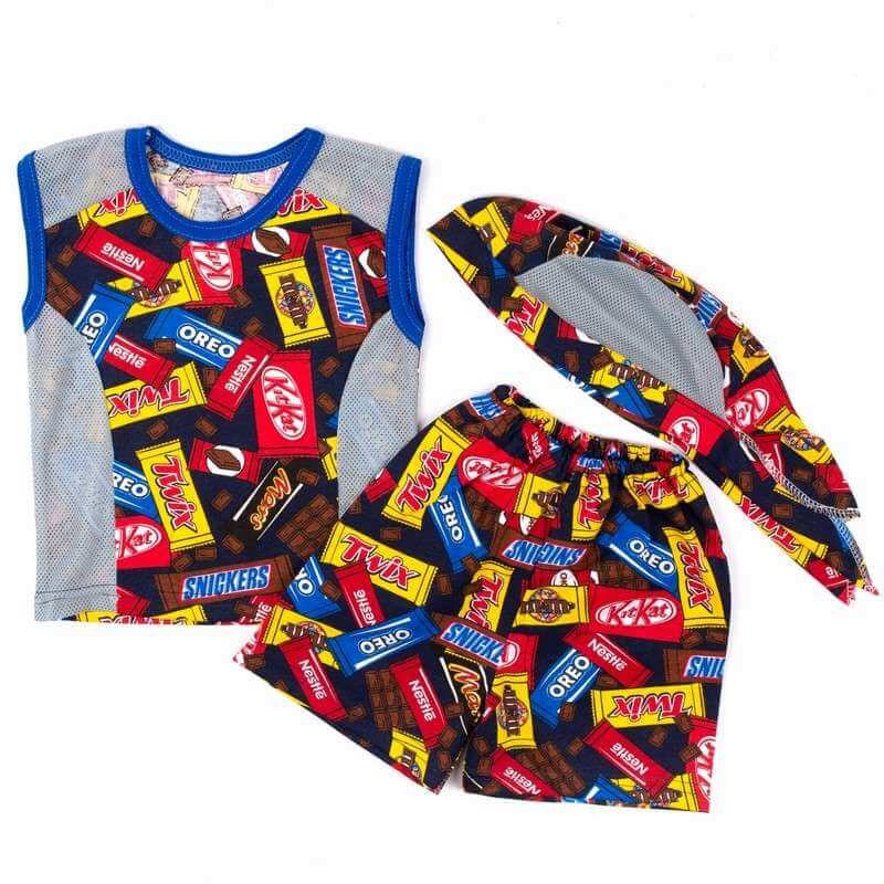 Дитячі комплекти на літо – відмінний та зручний варіант одежи для спекотної погоди. Представлений комплект пошитий з якісного бавовняного куліра в забрвлення цукерки. У представлений комплект входить майка безрукавка, шортики та бандана. На майці та бандані присутні вставки із сіткової тканини завдяки яким шкіра малюка зможе вільно дихати. Такий яскравий та стильний літній комплект стане незамінним у гардеробі Вашого малюка. У нашому інтернет-магазині «Арлекин» Ви зможете знайти якісний дитячий одяг за доступною ціною!
