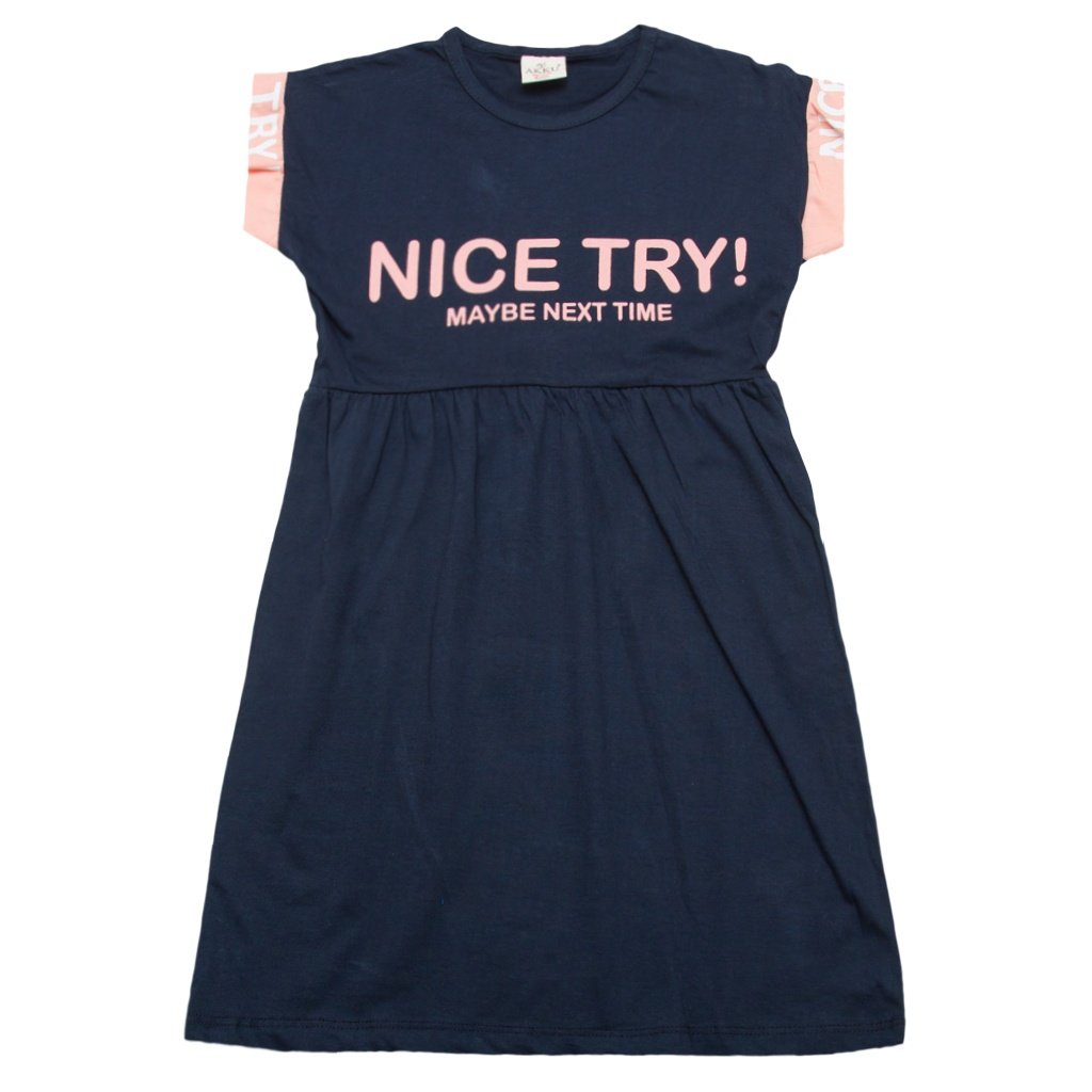 Всі дівчатка люблять гарненькі платтячка, блузочки, футболочки. У нашому інтернет-магазині неймовірне розмаїття стильних і привабливих суконь для дівчаток. Дана модель темно-синьої сукні виготовлена з якісного і гіпоалергенного трикотажу. Спереду є невелике фарбування у вигляді напису. Також рукава прикрашають манжети з таким же термонабивання. Сукня виглядає неймовірно легкою і повітряною. Це ідеальний варіант для Ваших маленьких принцес! Швидше оформляйте замовлення на нашому сайті та порадуйте свого малюка стильними обновочками.