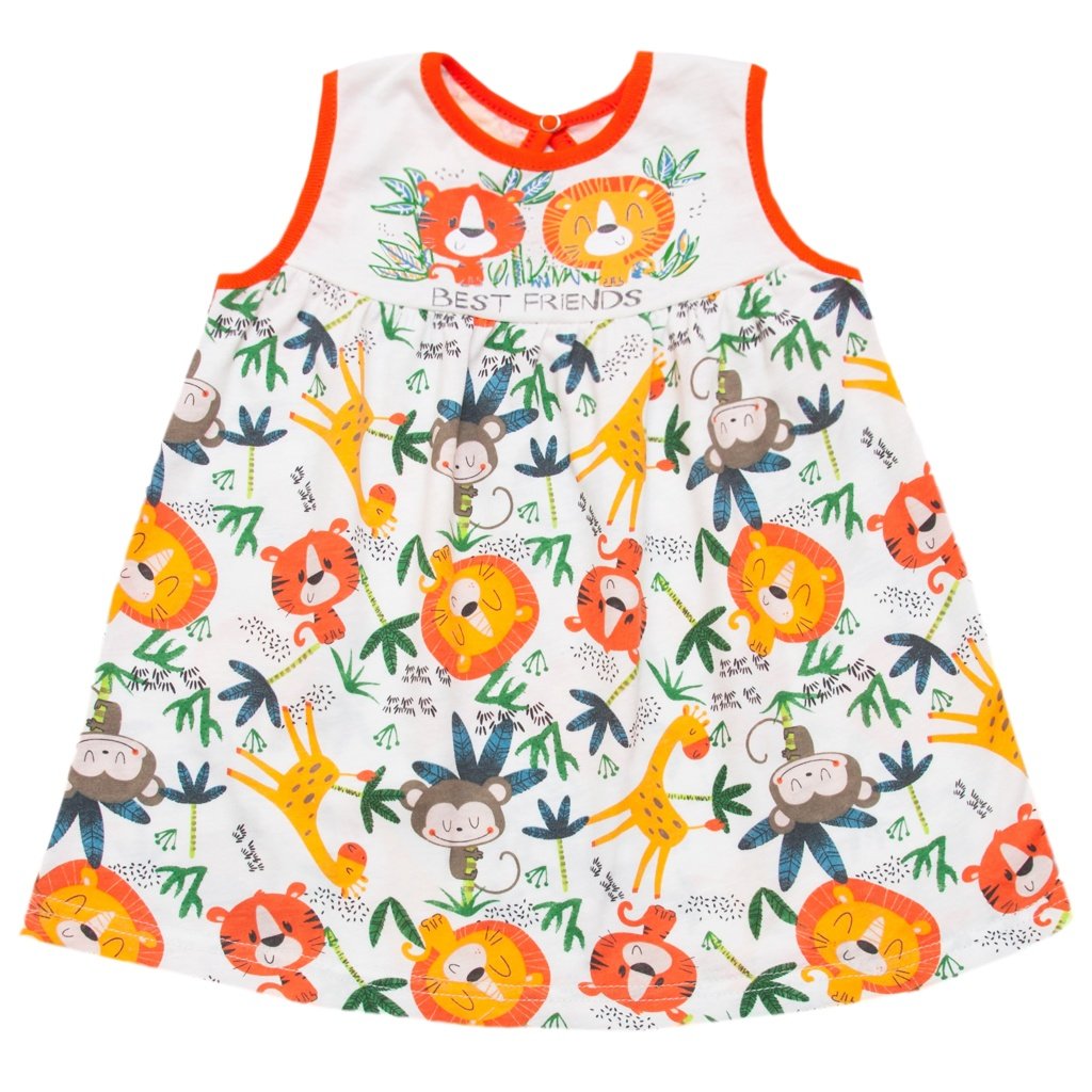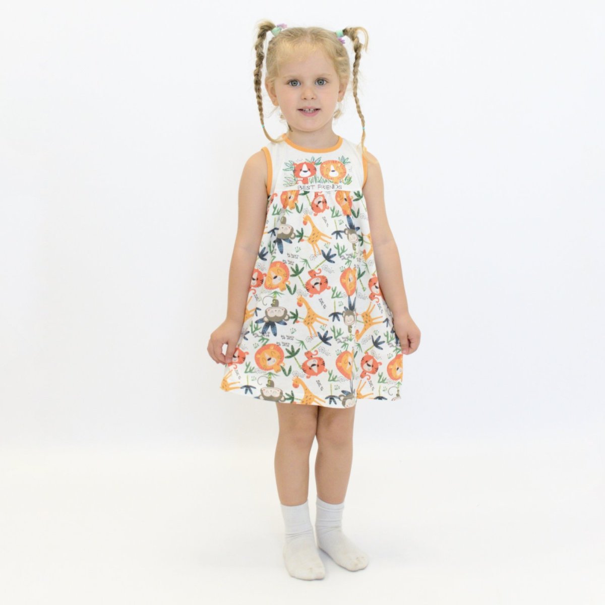 Сукня для дівчинки пошито з натурального якісного полотна. Полотно дуже м'яке, і до того ж приємне до тіла і в міру еластичне. Склад полотна 94% бавовни і 6% лайкри і за рахунок цього полотно добре тягнеться і модельки добре сідають по фігурі. Сукню комбіновано двома кольорами, верх по переду білий, низ яскравий кольоровий. Пройми і горловини оброблені руликом, на спинці є кнопочка. За переду сукні на кокетці є красива, мила покраска. Футболка виглядає красиво і оригінально, а натуральний матеріал подарує Вашій дитині комфорт.
