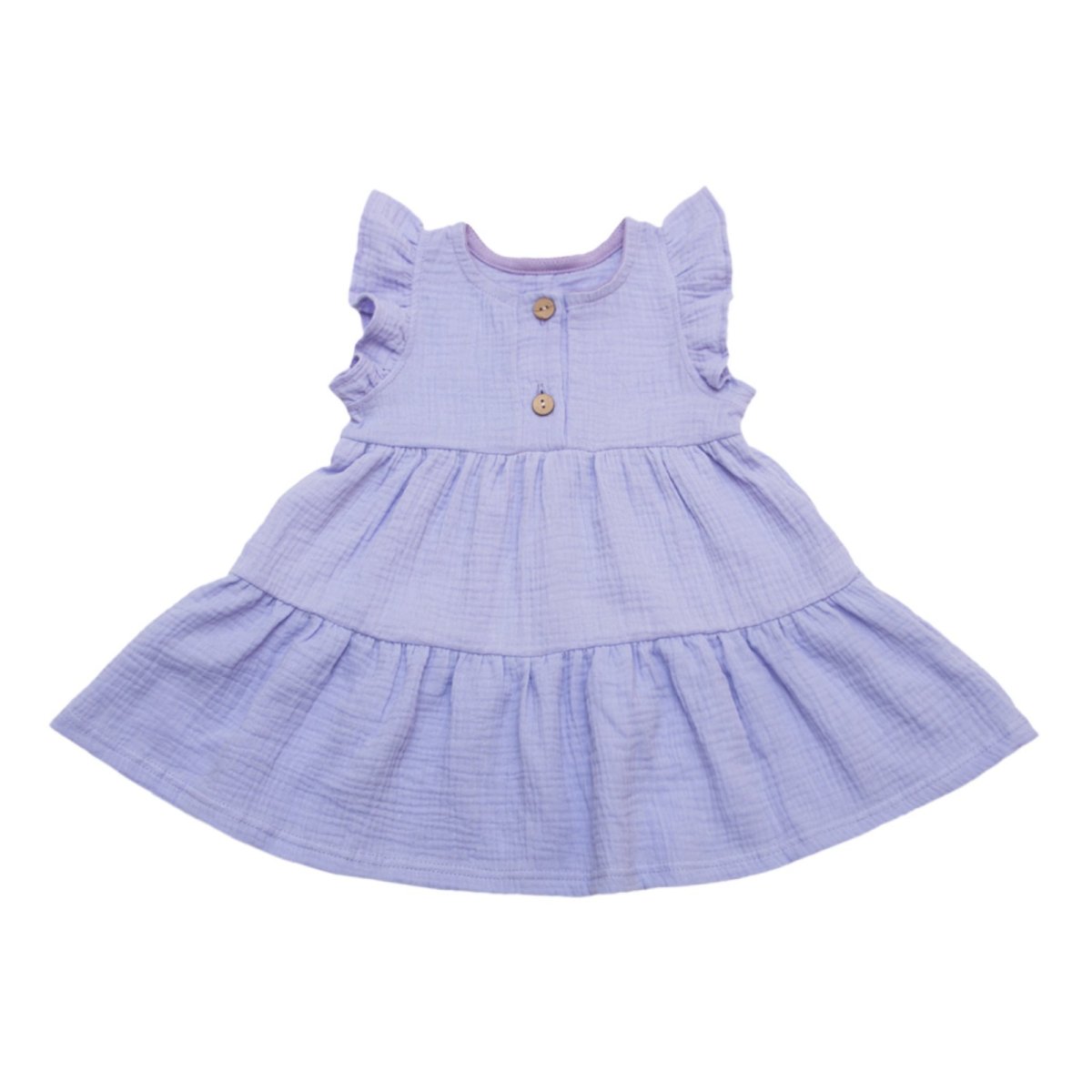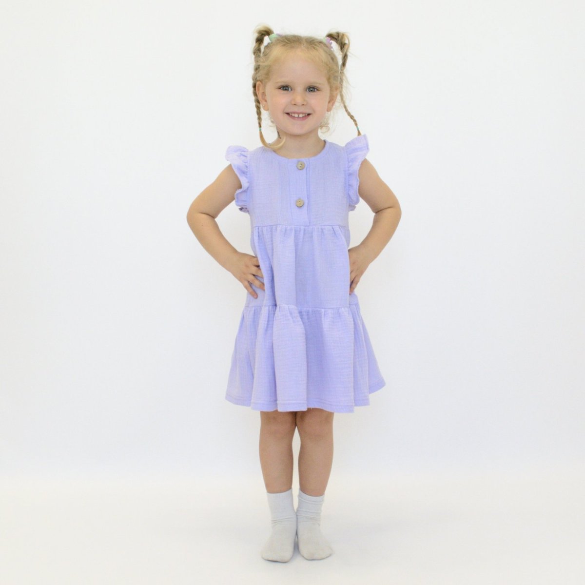 Повітряна легкість і ніжний стиль - найкраще поєднання для літнього гардеробу маленької модниці. Сукня з м'якого і дихаючого мусліну бузкового кольору приємно прилягає до тіла, дозволяючи шкірі дихати навіть у найспекотніший день. Акуратні крильця на плечах надають образу чарівний вигляд. Спереду виріб доповнений двома ґудзиками, які не тільки прикрашають, але й забезпечують зручність при переодяганні. Вільний крій дарує свободу рухів, а натуральна тканина ідеально підходить для чутливої дитячої шкіри. Ідеальний вибір для прогулянок, свят або фотосесій - ця сукня стане улюбленим елементом дитячого гардеробу.