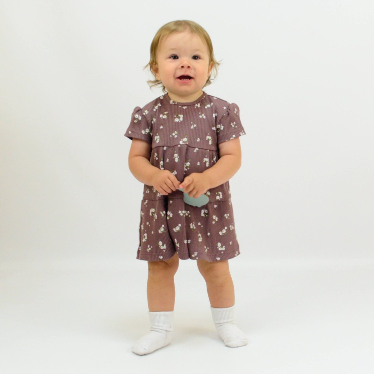 Іноді найкраще рішення - це простота з акцентом на комфорт. Дитяче плаття з полотна рубчик коричневого кольору з принтом квіточків якраз з таких варіантів: зручне, м'яке і при цьому дуже миле. Верх виконаний у форматі класичної футболки з коротким рукавом і округлою горловиною, що робить його особливо зручним у повсякденному носінні. Еластична тканина не сковує рухів і дарує дитині свободу під час ігор, прогулянок і активного відпочинку. Сукня прикрашена акуратним принтом і представлена в декількох кольорах, завдяки чому кожна дівчинка зможе вибрати те, що ближче саме їй.