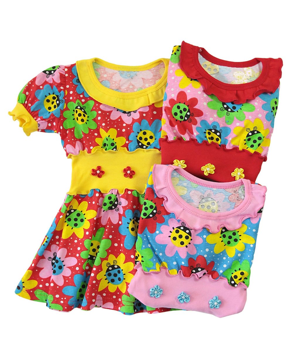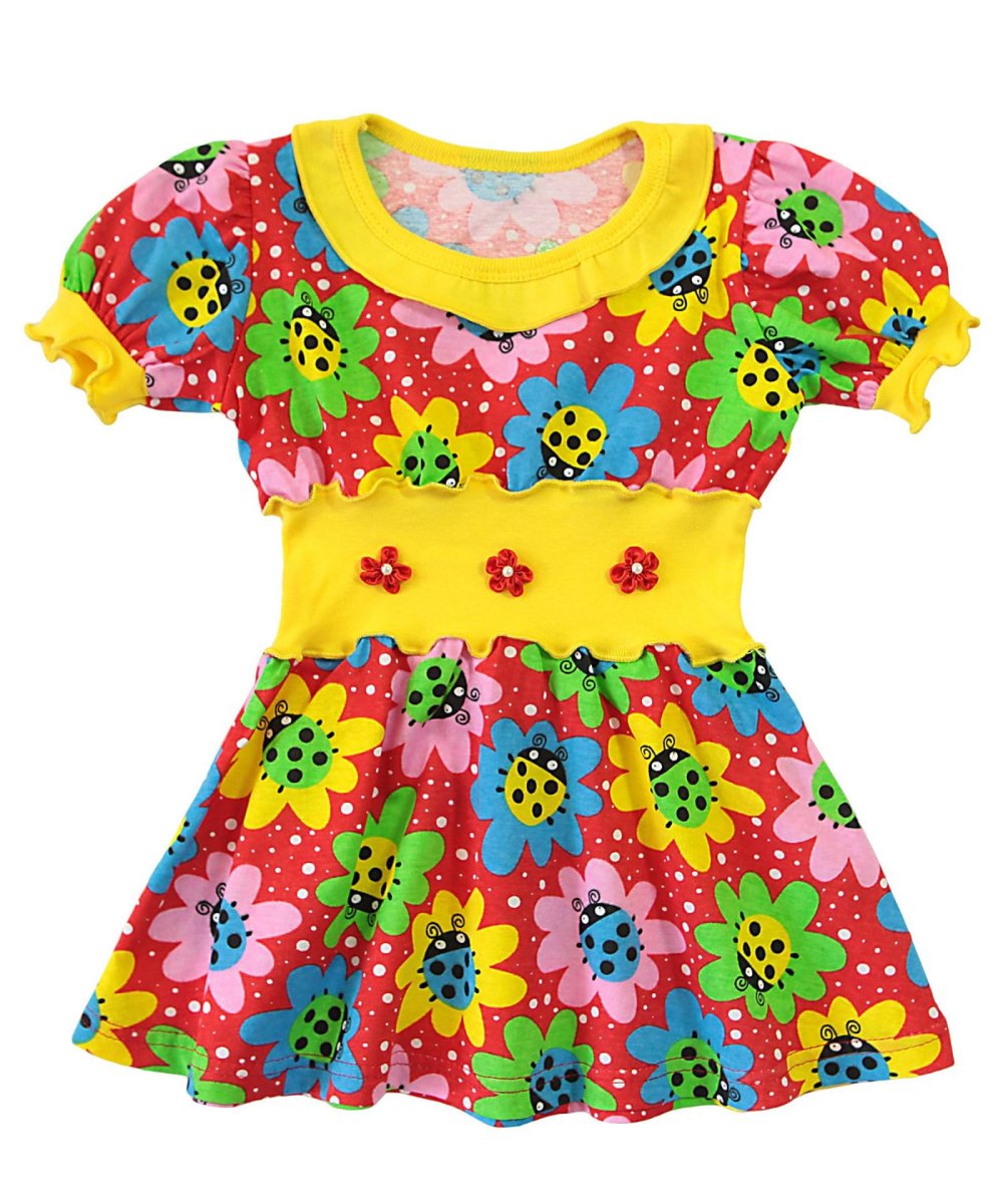 Прекрасним рішенням практичного одягу для дівчат у літній спекотний період буде кулірне плаття з коротким рукавчиком. Таке плаття любий батько зможе легко придбати в нашому інтернет-магазині. На горловинці та низу рукавчика манжетик із однотонного стрейчу. На поясі вставка-гумка з однотонної гумки, по центру – різноманітна кольорова фурнітура у вигляді квіточок з атласної стрічки з маленькою бусинкою. Горловинка, рукавчик та шви з'єднання втачного пояса-гумки оброблені швом-піке з ниточкою у колір малюнка на набивному полотні. Низ спідниці сукні під розпошив.