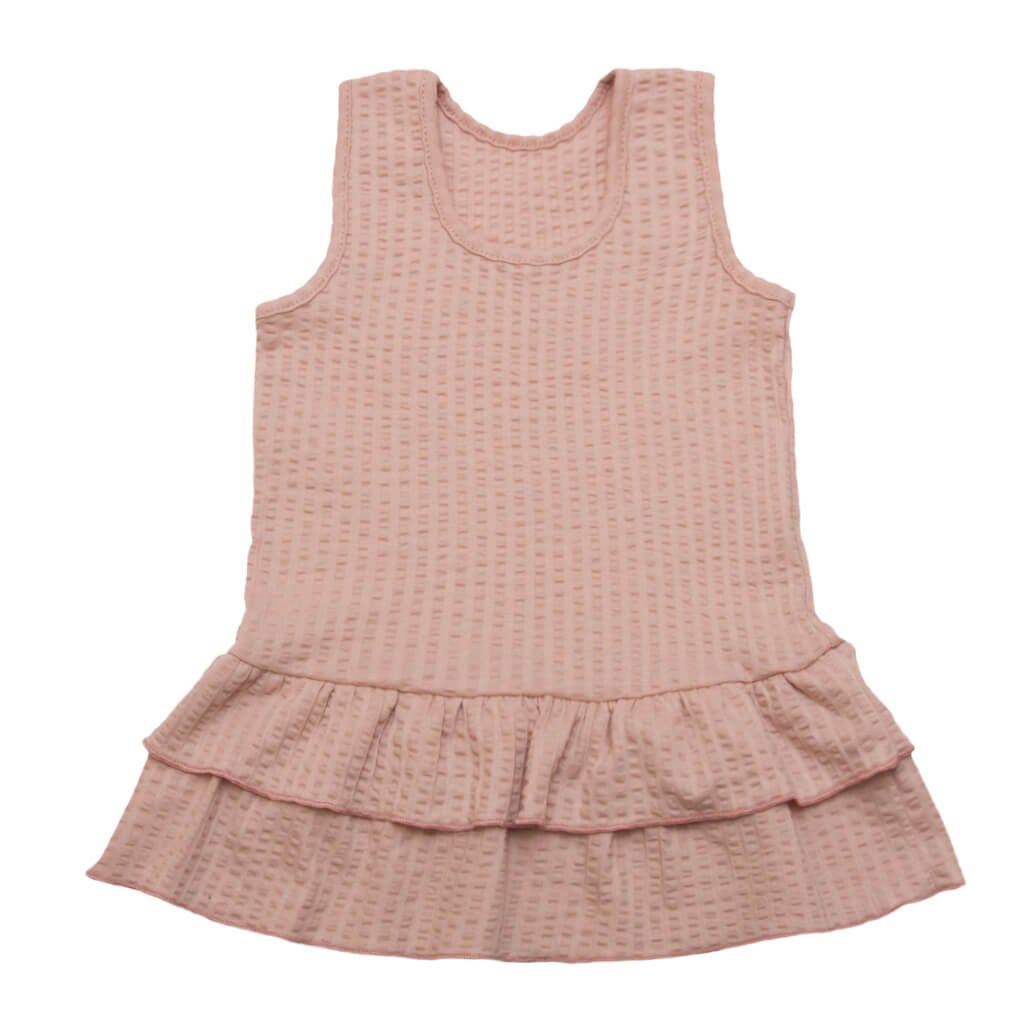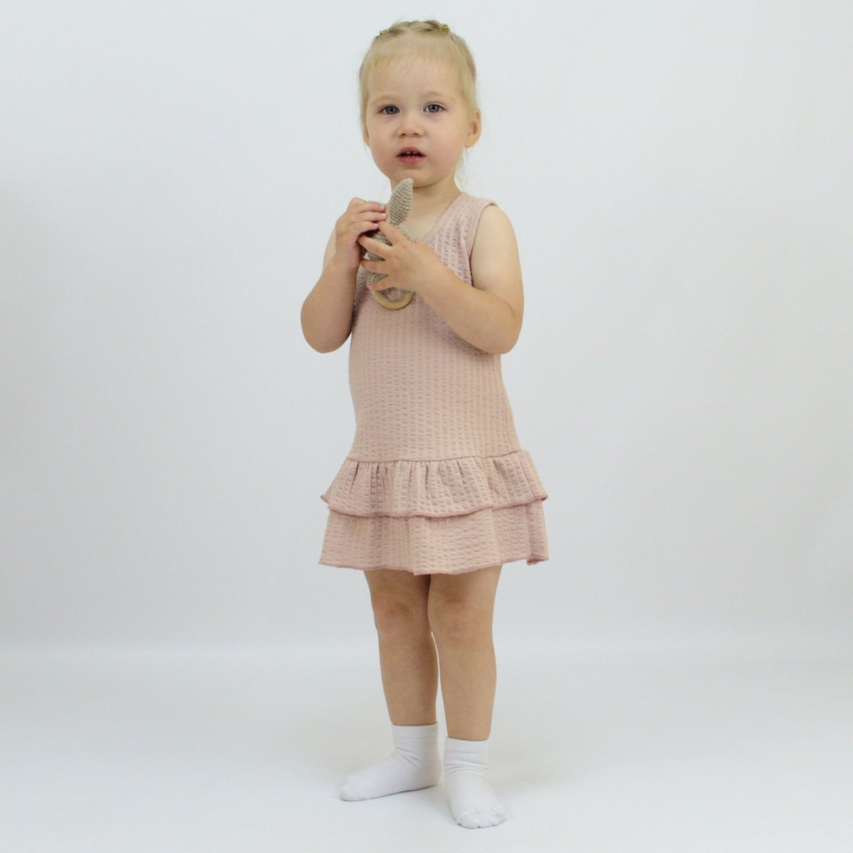 У світі дитячого одягу завжди є речі, які підкорюють з першого погляду своєю простотою і легкістю. Сарафн для дівчинки пудрового кольору з полотна інтерлок жакард - якраз такий виріб. Легка фактурна тканина приємна до тіла, відмінно пропускає повітря, що особливо важливо в теплу пору року. Інтерлок-жаккард вирізняється ніжною текстурою і водночас досить щільною структурою, завдяки чому сарафан добре тримає форму і не втрачає привабливого вигляду навіть після безлічі прань. Вільний крій моделі та відсутність рукавів забезпечує дитині максимальний комфорт, не обмежуючи рухів і даючи змогу активно грати та бігати.
