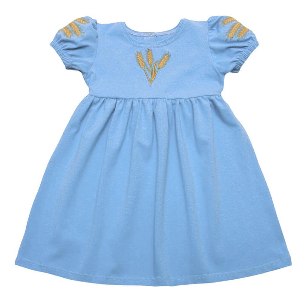 Нова модель дитячого платтячка для дівчинки блакитного кольору з вишивкою колосків стане справжньою окрасою гардероба вашої маленької модниці. Пошито з якісного бавовняного полотна - стрейч-куліра. Цей матеріал вирізняється своєю ніжною та еластичною структурою. Також така тканина легка і повітряна, тому представлена модель сукні - ідеальний варіант на теплу пору року. Доповнено виріб чарівною вишивкою на грудях, а також на рукавах. Представлена сукня для дівчинки відмінно підійде як для повсякденного носіння, так і для більш святкових днів.