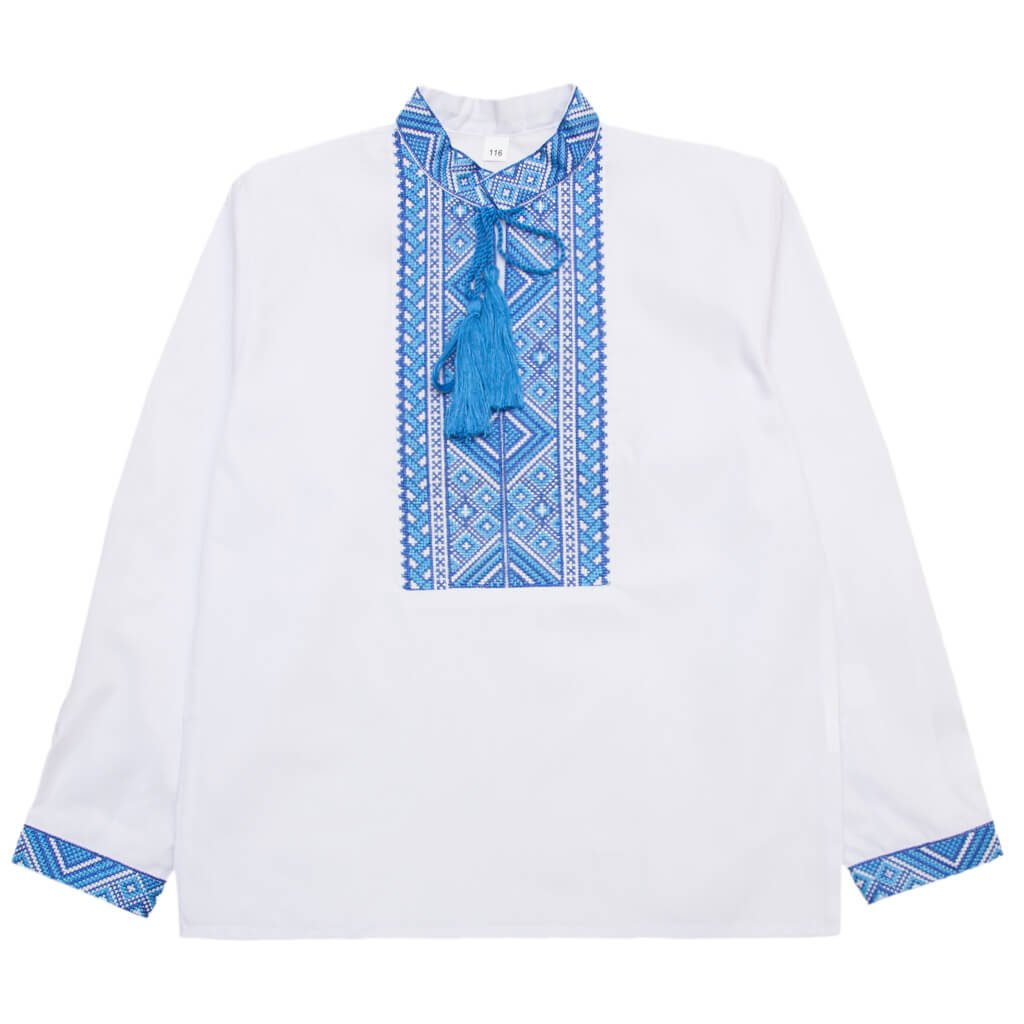В нашому інтернет-магазині оновлення асортименту. Красиві вишиванки як для хлопчиків, так і для дівчаток. Дана модель представлена в білому кольорі, модель виконана в стилі сорочки з коміром стійкою. По переду є машинна вишивка також і на манжетах рукавів. Горловинка зав'ялюється на мотузочку в колір вишивки. У такій вишиванці Ваш хлопчик буде виглядати стильно, красиво. І в той же час йому буде комфортно і зручно за рахунок правильного крою моделі і якісної тканини з якої виготовлено даний виріб.