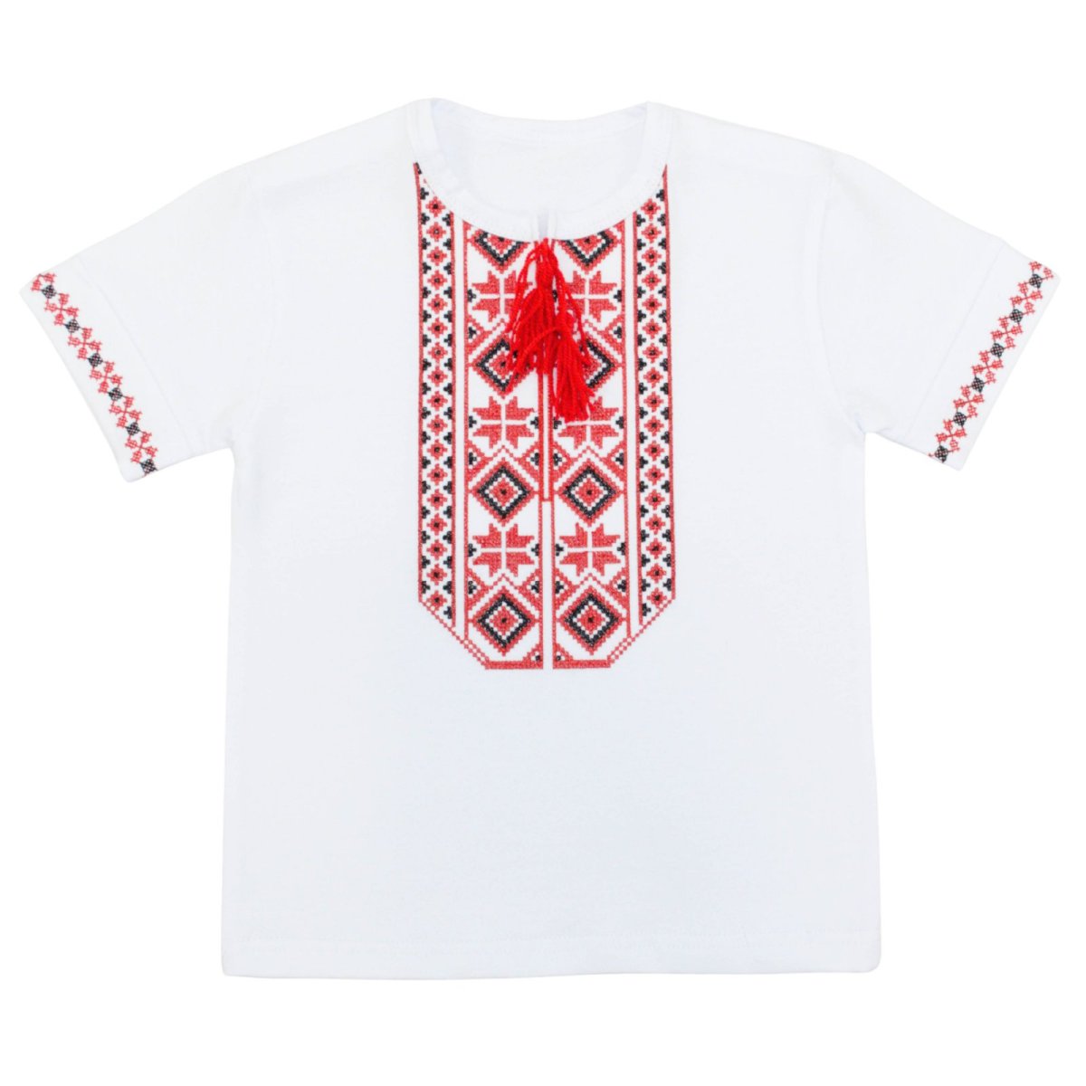Ця вишиванка для хлопчика з коротким рукавом, виготовлена з чисто білого полотна стрейч-кулір, з вишивкою червоний орнамент. Ви завжди можете придбати в нашому інтернет-магазині цю модель. Така вишиванка згодиться хлопчику як для урочистих подій в дитячому садку, так і для експлуатації на кожен день. Горловина вишиванки оброблена руликом, є розріз для зручності при одяганні, з атласними стрічками-зав'язками. До короткого рукава з основного полотна пришитий манжет з вишивкою. Розріз по горловині також прикрашений вишивкою в українському стилі. Низ моделі розшитий контрастною ниточкою в колір вишивки-блакитного і жовтого кольору.