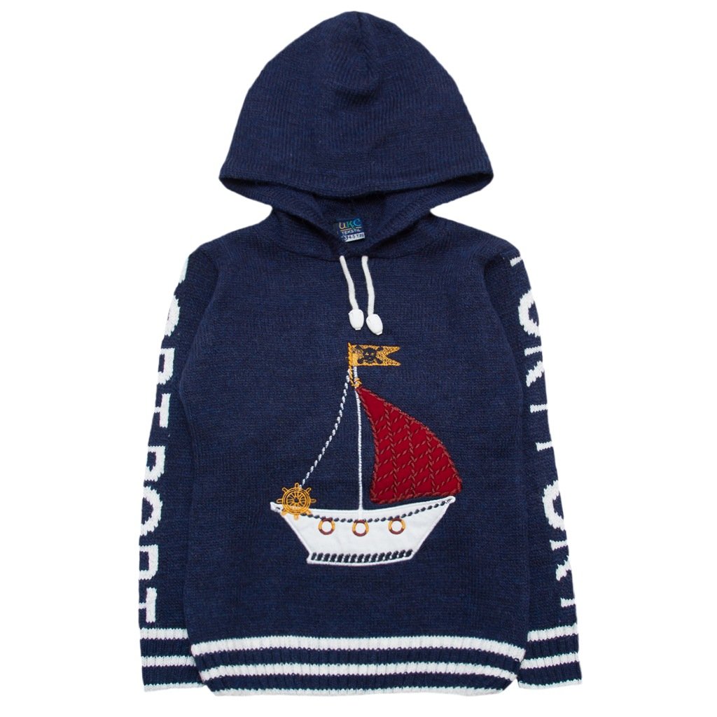 Хочете щоб Ваша дитина завжди була в в теплі і виглядала красиво і сучасно? Тоді Вам точно до нас! Представляємо Вашій увазі темно-синій светр для хлопчика. Він дуже теплий і приємний до тіла. На даній моделі присутній капюшон, що дуже зручно. Адже коли на вулиці холодно або сильний вітер, Ви з легкістю можете дістати з під куртки капюшон і одягнути на голову, при цьому захистивши ще й шию. На капюшоні є шнурочки, які можна стягнути і зав'язати. На рукавах і попереду вироба декор у вигляді написів і малюнка. Придбайте цей светр на нашому сайті і Ви неодмінно залишитеся задоволені покупкою!