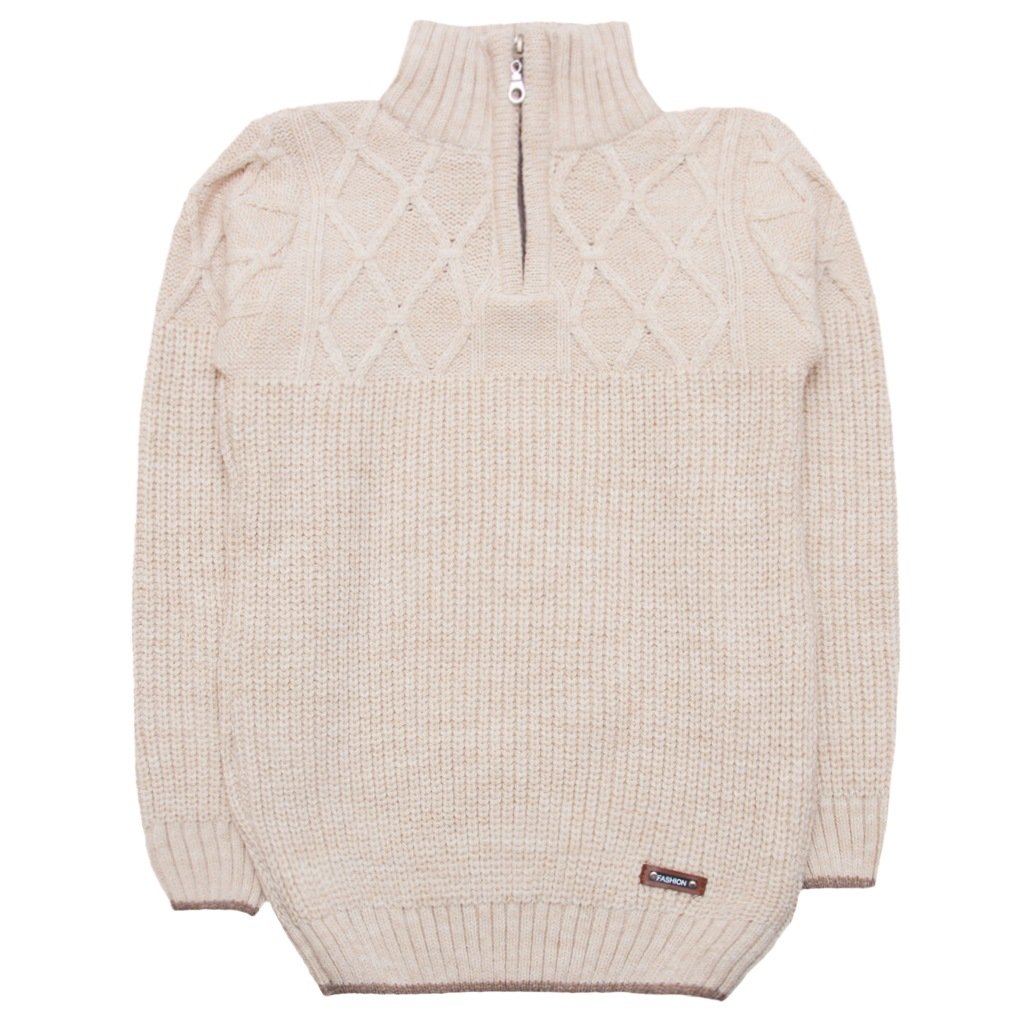 Неймовірно теплий, бежевий светр для хлопчика. Однотонний, строгий і класичний светр підійде для походів в школу, в гості або для будь-яких інших заходів. Високе горло зігріє хлопчика навіть в найпрохолоднішу погоду, але при цьому, якщо потрібно - можна розстебнути горло блискавкою. По верху вироба виконаний орнамент з в'язки, що додає родзинку в цю модель. Знизу є маленька нашивка, яка так само, служить декором. Підберіть бажаний колір і потрібний розмір для свого хлопчика і Ви неодмінно залишитеся задоволені покупкою!