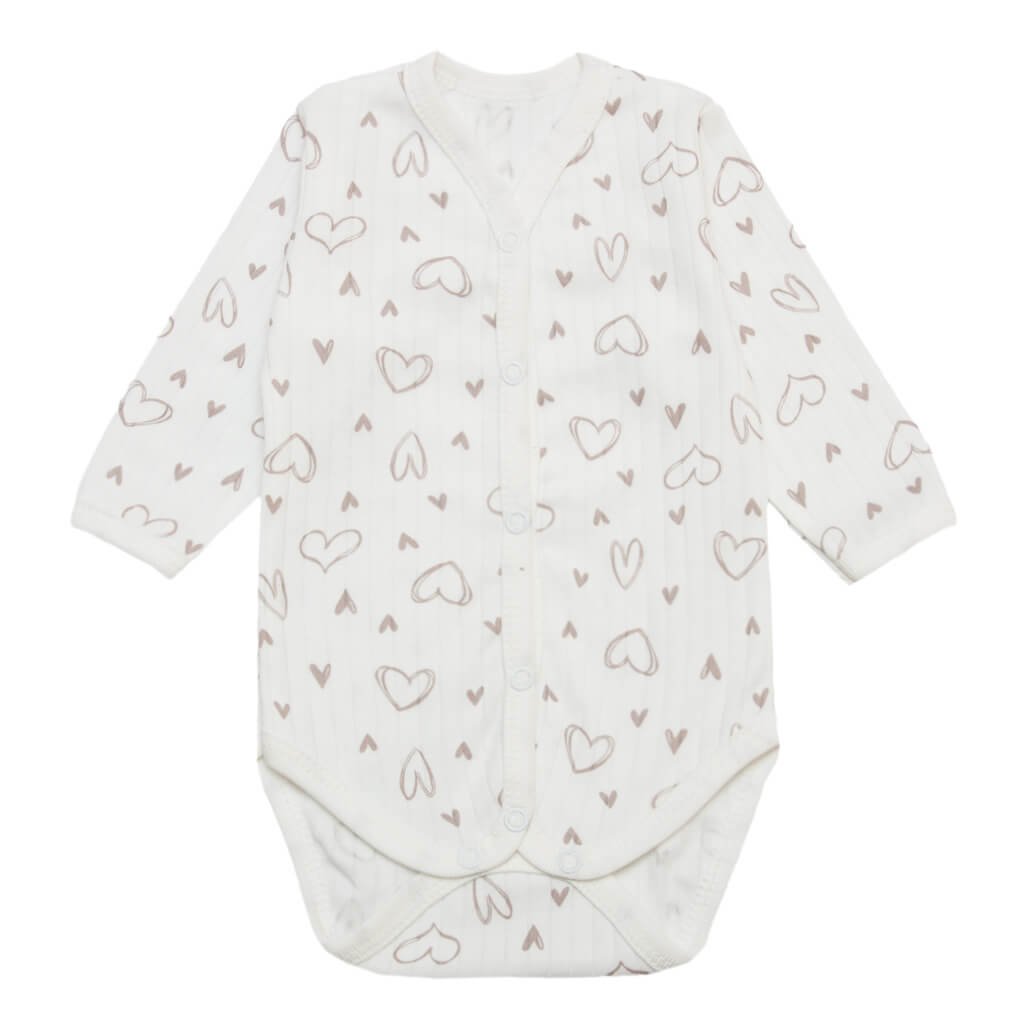 Дитячий боді молочного кольору з принтом сердечок зі зручною застібкою на кнопках стане чудовим вибором для комфортного і практичного догляду за малюком. Полотно інтерлок рапорт забезпечує приємну на дотик текстуру та ідеально підходить для чутливої дитячої шкіри. Завдяки універсальному дизайну і декільком варіантам забарвлень, боді підійде як для повсякденного використання, так і для особливих моментів. Кнопки, розташовані на передній частині, роблять переодягання легким і швидким, а якісна тканина не втрачає своїх властивостей навіть після численних прань. Такий боді не тільки має гарний вигляд, а й дарує малюкові комфорт, залишаючи свободу рухів.