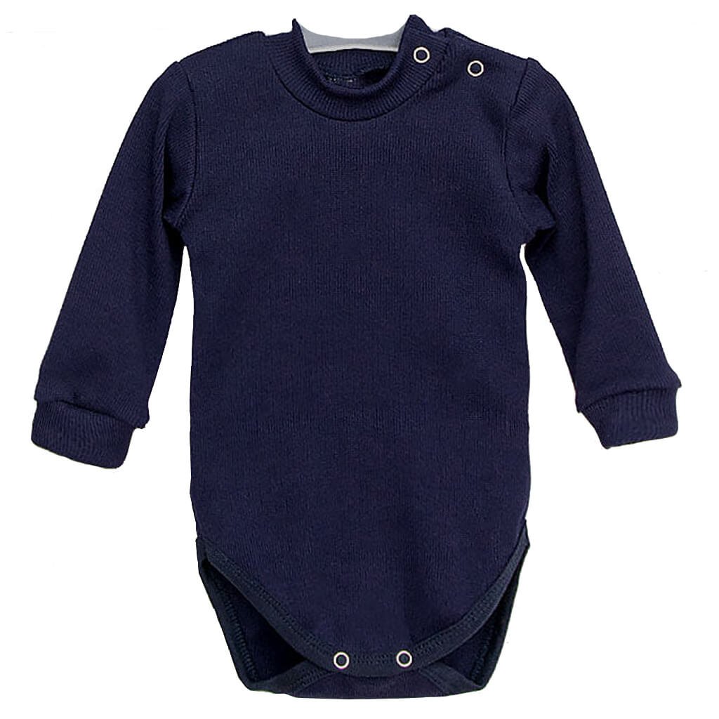Дитячий боді-гольф з довгим рукавом та коміром-стійкою - один із найкомфортніших варіантів одягу для дитини на осінь. Боді-гольфик темно-синього кольору одягається через голову, тому для зручності одягання на плечику є кнопки, завдяки яким горловина стає ширшою. Зручність таких боді для дівчинки та хлопчика також полягає в тому, що внизу є фіксація на кнопках, а це означає, що навіть під час найактивніших рухів дитини бодік не задиратиметься, що дуже важливо в прохолодну пору року. Дитячий боді з рубчика без утеплення підійде на демісезонний період.