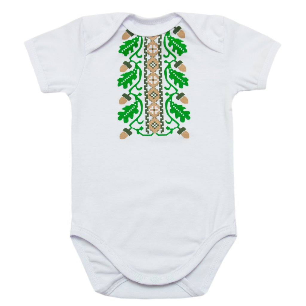 Дитячий бодік пошитий з високоякісної фулікри, яка повністю складається з натуральної бавовни. Вироби з даного матеріалу дуже приємні до тіла, добре тримають свою форму та мають високу зносостійкість. Представлена модель боді - одна з найпоширеніших та найзручніших. Верх виконаний з коротким рукавом та горловиною у вигляді «човника». А низ виробу застібається на кнопочки. Цей бодік прикрашений цікавим фарбуванням, на якому зображено орнамент-дубок. У такому боді Ваш малюк почуватиметься максимально комфортно та затишно.