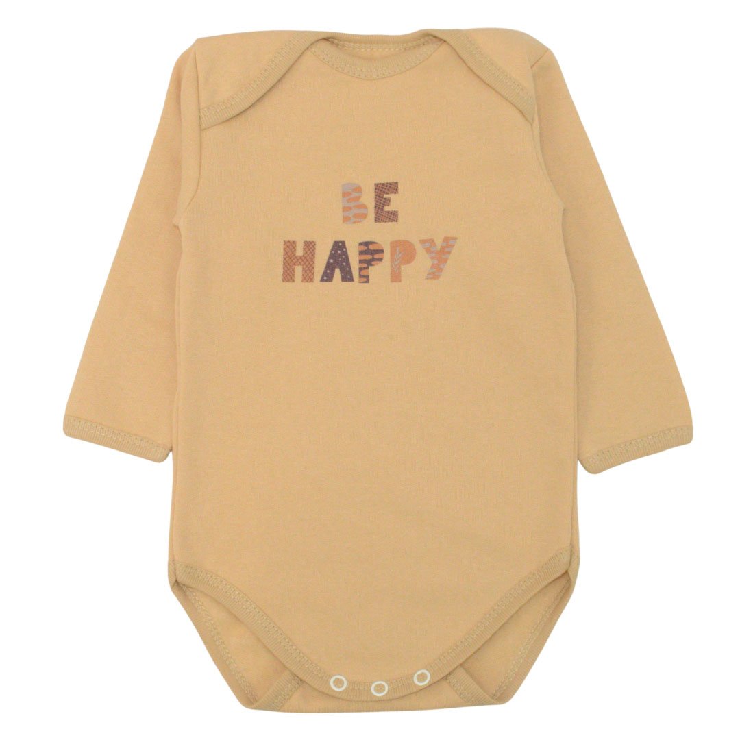 Бодік дитячий, бежевого кольору, напис Be happy, пошитий з натурального бавовняного полотна буде кращим варіантом. Вироби з такого полотна мають великий попит, оскільки мають багато позитивних якостей. Тканина гарно зберігає тепло тіла малечі, в той же час дуже м'яка, й приємна на дотик до ніжної шкіри малюка. Не потребує складного догляду і не кошлатиться. Горловина на цьому бодіку зроблена човником, а до низу є кнопочки. Рукавці та горловина, а також низ боді, оброблені бейкою. А прикрашає бодік дуже красиве й веселе тематичне зображення спереду виробу.