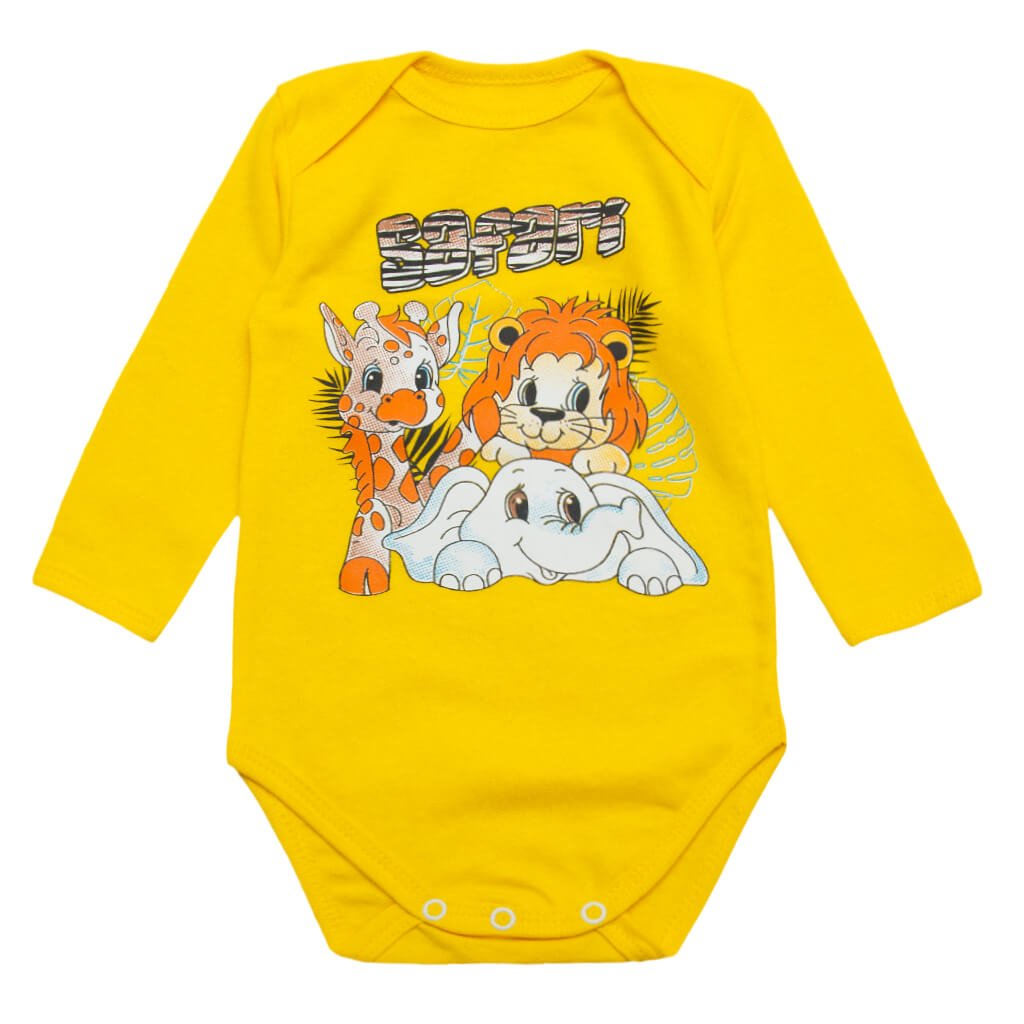 Бодік дитячий, жовтого кольору, принт сафарі, пошитий з натурального бавовняного полотна буде кращим варіантом. Вироби з такого полотна мають великий попит, оскільки мають багато позитивних якостей. Тканина гарно зберігає тепло тіла малечі, в той же час дуже м'яка, й приємна на дотик до ніжної шкіри малюка. Не потребує складного догляду і не кошлатиться. Горловина на цьому бодіку зроблена човником, а до низу є кнопочки. Рукавці та горловина, а також низ боді, оброблені бейкою. А прикрашає бодік дуже красиве й веселе тематичне зображення спереду виробу.