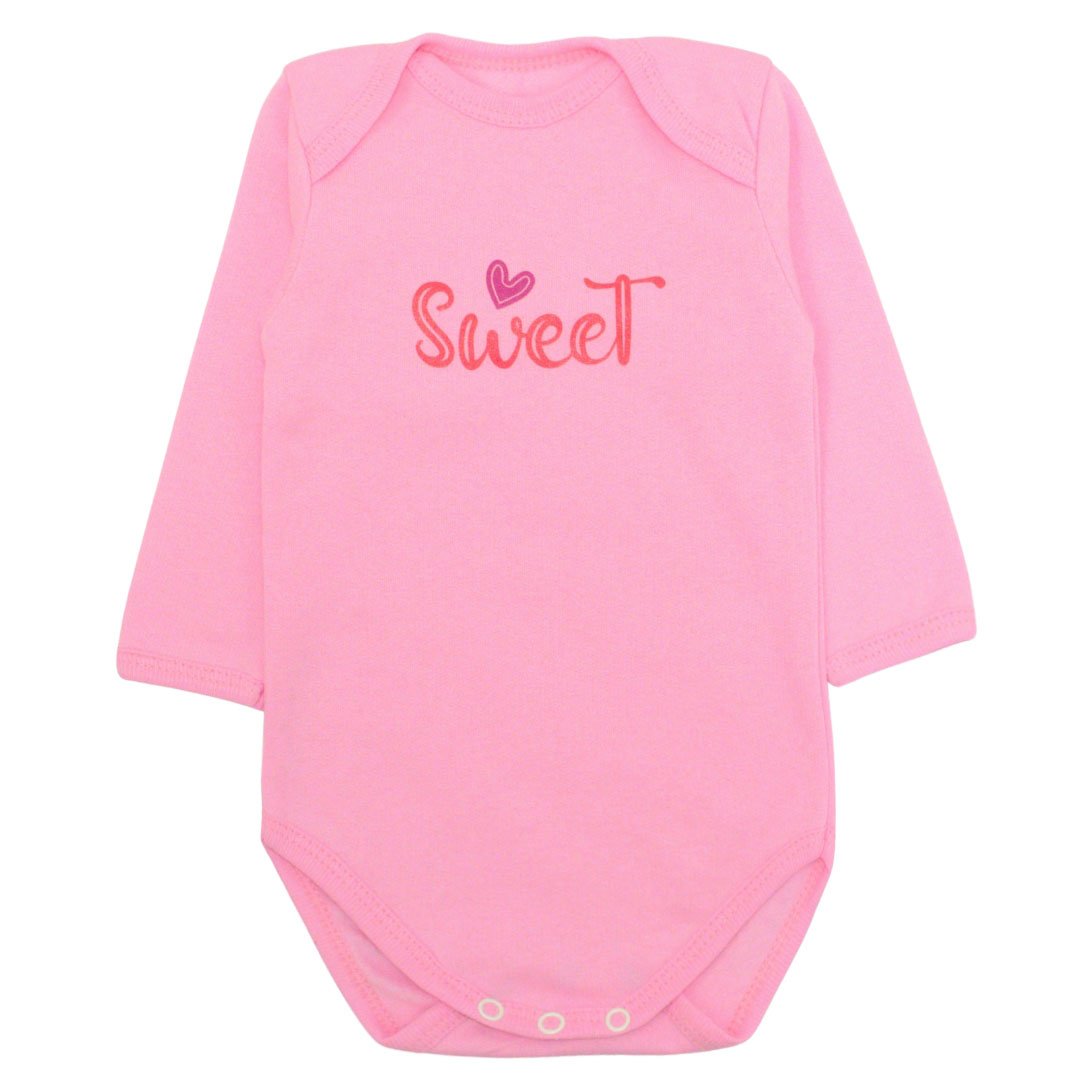 Бодік дитячий, рожевого кольору, напис Sweet, пошитий з натурального бавовняного полотна буде кращим варіантом. Вироби з такого полотна мають великий попит, оскільки мають багато позитивних якостей. Тканина гарно зберігає тепло тіла малечі, в той же час дуже м'яка, й приємна на дотик до ніжної шкіри малюка. Не потребує складного догляду і не кошлатиться. Горловина на цьому бодіку зроблена човником, а до низу є кнопочки. Рукавці та горловина, а також низ боді, оброблені бейкою. А прикрашає бодік дуже красиве й веселе тематичне зображення спереду виробу.