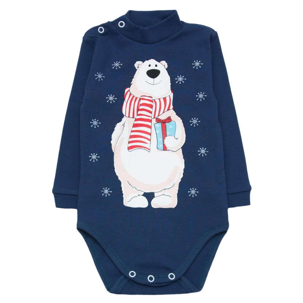 Бодіки - невід'ємна частина гардероба кожного малюка. Напередодні новорічних свят, наш інтернет-магазин підготував для Вас чудову модель дитячого боді. Виріб пошито з високоякісного трикотажного матеріалу - стрейч-начосу синього кольору, принт ведмедик. Це полотно має у своєму складі невеликий відсоток еластану, завдяки чому виріб може досить добре тягнутися, і водночас повертатися до своєї первісної форми. Усередині присутнє начісне утеплення. А прикрашає бодік неймовірне фарбування на передньому боці, яке виконане в стилі зимових свят.