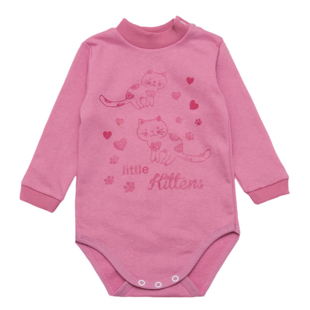 Боді-гольф це ідеальний варіант одягу на холодну пору року. Так шия щільно закривається стійкою бодіка, і малюкові не страшні протяги. Дана модель, рожевого кольору, принт котиків, пошита з начісного полотна, яке складається повністю з бавовни. Внизу боді є кнопки, що полегшує перевдягання дитини. Також на плечі є кнопки. Окрасою цього боді є красивий малюнок мультфільму по переду виробу. Також у нашому інтернет-магазині ви можете придбати й інші вироби для малюка, такі як чоловічки, штанці і так далі.
