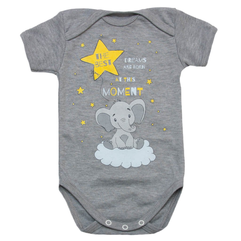 Легкий літній бодік дитячий виготовлений з бавовняного полотна інтерлок сірого кольору. Горловина бодіка виконана у вигляді "човника". Виріб з коротким рукавом. Спереду великий малюнок слоника, який дуже мило виглядатиме, коли Ви одягнете боді на дитину. Краї цієї моделі оброблені контрастною бейкою. На бодіку немає зайвої фурнітури, тому вашій дитині буде комфортно, адже нічого не буде давити і заважати. Підберіть вподобаний колір і малюночок, та замовте якісний виріб в нашому інтернет-магазині!