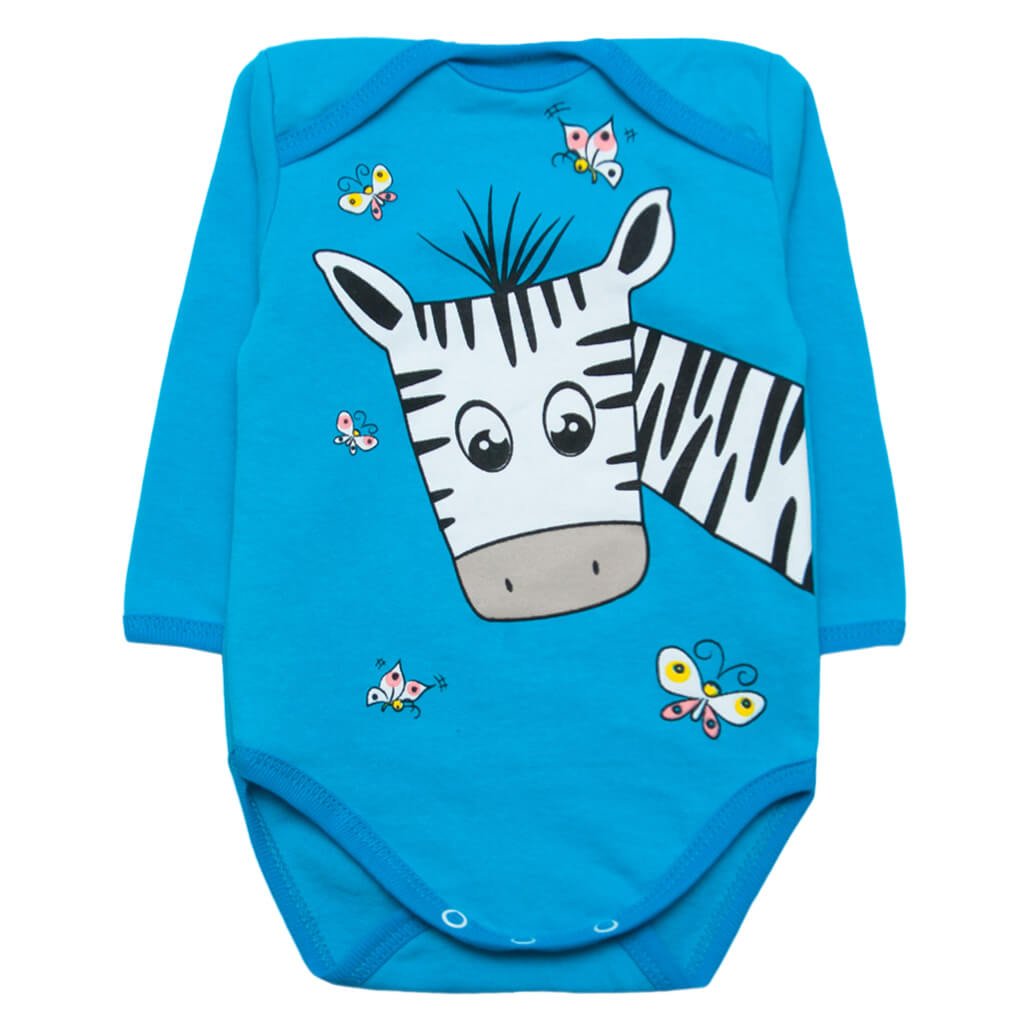 Бодік для маленького хлопчика, бірюзового кольору, принт зебра, пошитий з натурального бавовняного полотна буде кращим варіантом. Вироби з такого полотна мають великий попит, оскільки мають багато позитивних якостей. Тканина гарно зберігає тепло тіла малечі, в той же час дуже м'яка, й приємна на дотик до ніжної шкіри малюка. Не потребує складного догляду і не кошлатиться. Горловина на цьому бодіку зроблена човником, а до низу є кнопочки. Рукавці та горловина, а також низ боді, оброблені бейкою. А прикрашає бодік дуже красиве й веселе тематичне зображення спереду виробу.
