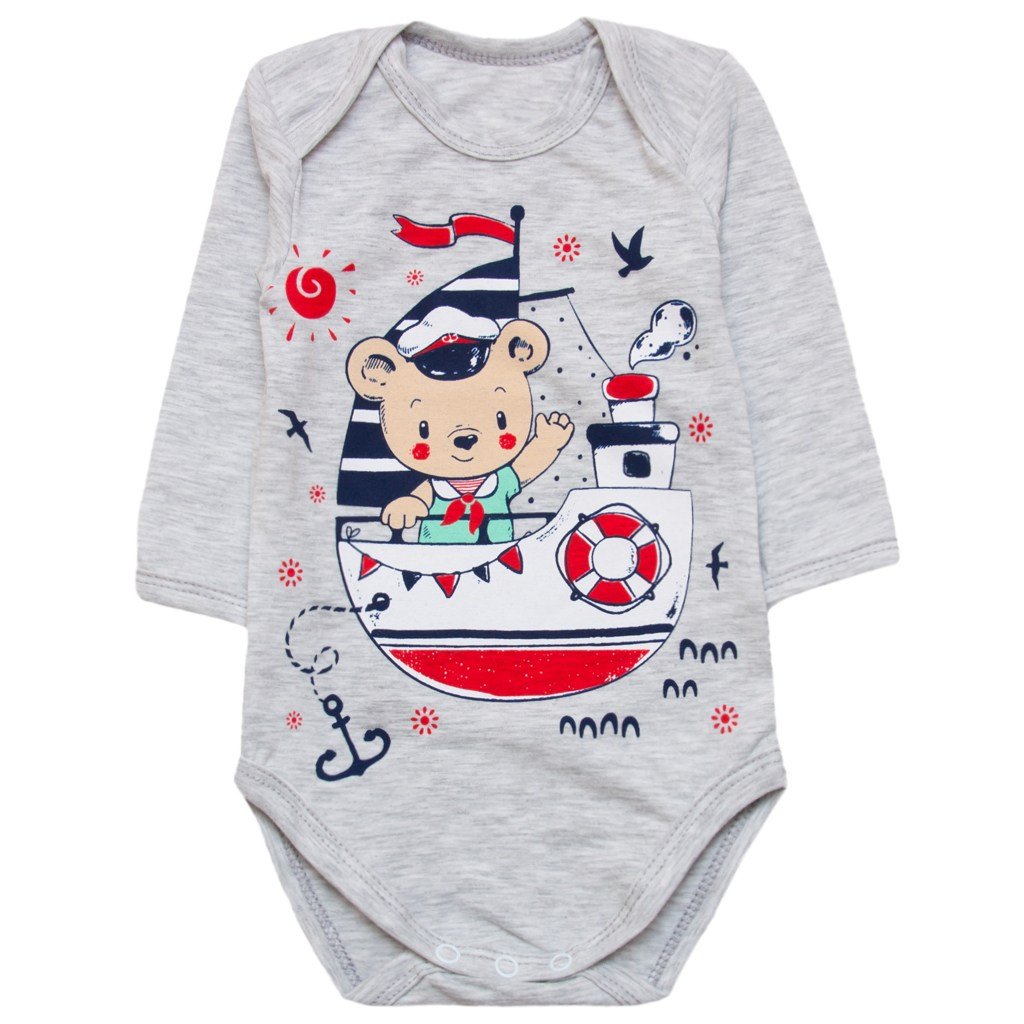 Боді для хлопчика з м'якого, приємного на дотик полотна стрейч-кулір. У складі є не великий відсоток лайкри, за рахунок чого матеріал добре тягнеться і сідає по фігурі. Боді з довгим рукавом, і горловиною човником. Низ боді, як горловина і рукава оброблені бейкою, підібраною в колір полотна. По низу є три кнопочки, на які і застібається бодік. Прикрашає бодік красива, мила покраска на дитячу тематику. У такому виробі, Вашій дитині буде комфортно і зручно. Приємних покупок в нашому інтернет магазині.