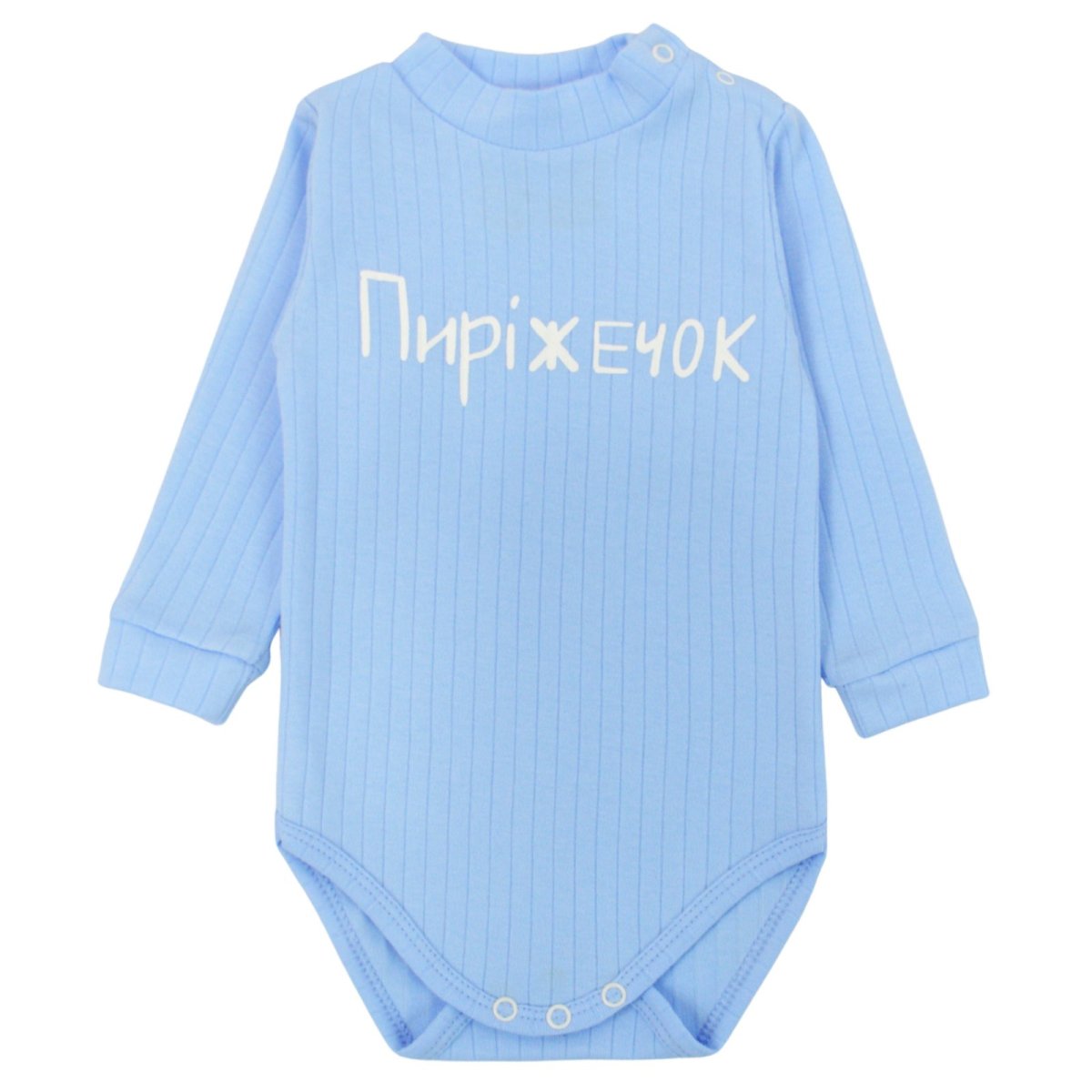 Є одяг, який відразу викликає посмішку - ще до того, як малюк його приміряв. Цей боді-гольф блакитного кольору якраз з таких: ніжний, зручний і з милим написом Пиріжечок, який додає образу особливого настрою. Модель виконана з полотна інтерлок рапорт тканина м'яка, еластична і приємна до тіла, відмінно підходить для щоденного носіння і не подразнює шкіру. Горловина-стійка акуратно закриває шию і робить боді особливо комфортним в міжсезоння. Для зручності переодягання передбачені кнопочки на плечі. А застібка між ніжок допомагає швидко змінити підгузник, не знімаючи виріб повністю.
