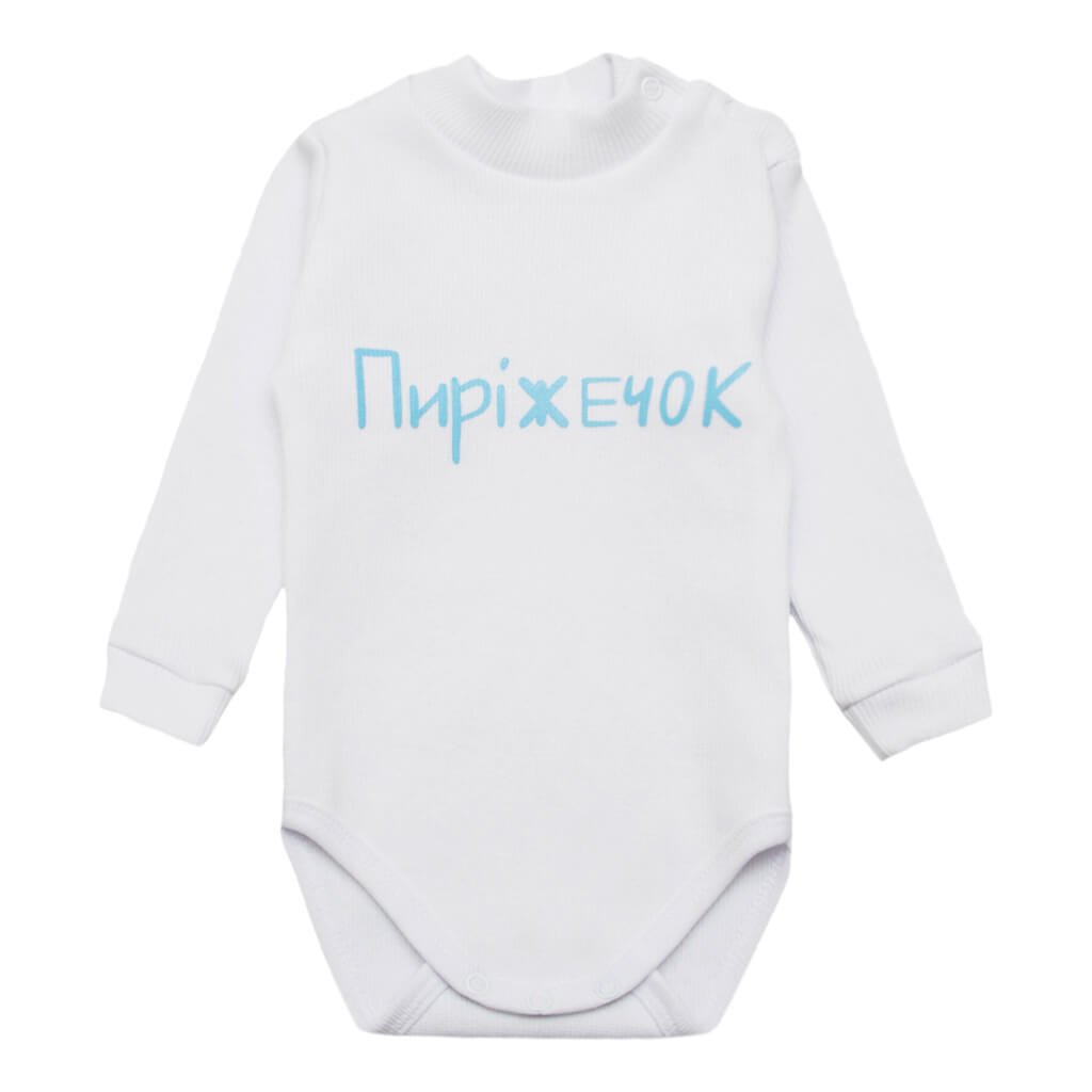 Дитячий боді-гольф виготовлений з м'якого полотна рубчик білого кольору, який відмінно підійде як хлопчикам, так і дівчаткам. Завдяки еластичній горловині з невеликою стійкою і кнопці на плечі, боді легко надягати і знімати, не створюючи дискомфорту для дитини. Рукава оброб лені еластичними манжетами. Внизу, між ніжок, передбачені кнопочки для зручної та швидкої зміни підгузка, що робить боді особливо практичним для повсякденного носіння. На передній частині виробу розташований декоративний напис Пиріжечок, який додає чарівний акцент.