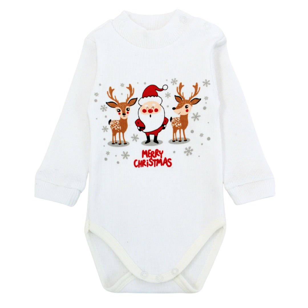 Дитячий боді-гольф виготовлений з м'якого полотна рубчик білого кольору, який відмінно підійде як хлопчикам, так і дівчаткам. Завдяки еластичній горловині з невеликою стійкою і кнопці на плечі, боді легко надягати і знімати, не створюючи дискомфорту для дитини. Рукава оброблені еластичними манжетами. Внизу, між ніжок, передбачені кнопочки для зручної та швидкої зміни підгузка, що робить боді особливо практичним для повсякденного носіння. На передній частині виробу розташований кумедний малюнок санти, який додає чарівний акцент.