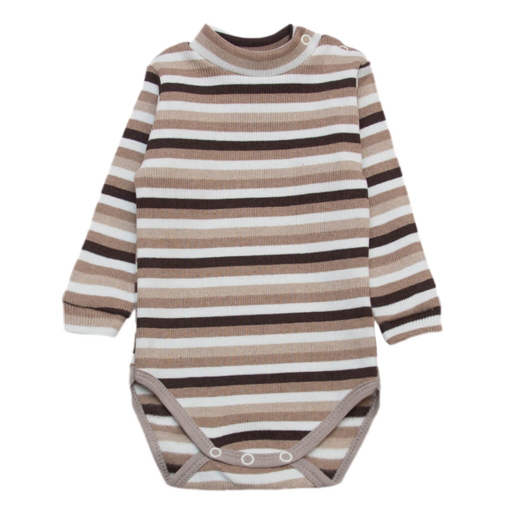Теплий дитячий боді-гольф, виготовлений з полотна - рубчик з начісм. Тканина в полоску, в коричневих відтінках, відрізняється м'якою текстурою, вона приємна до тіла, а за рахунок начіс дуже тепле. Вироби з такого полотна не кошлатятся, зберігають свою форму після прання. Горловина у бодіку стіойочка, на одному плечі є кнопочки. В нижній частині виріб оброблений бейкою, підібраною в колір полотна, а також застібається на кнопочки. На рукавах манжети з основного полотна. У такому боді Вашому малятку буде дуже тепло та комфортно. Ця модель представлена у декількох варіантах забарвлення, тому можна придбати відразу декілька штучок.