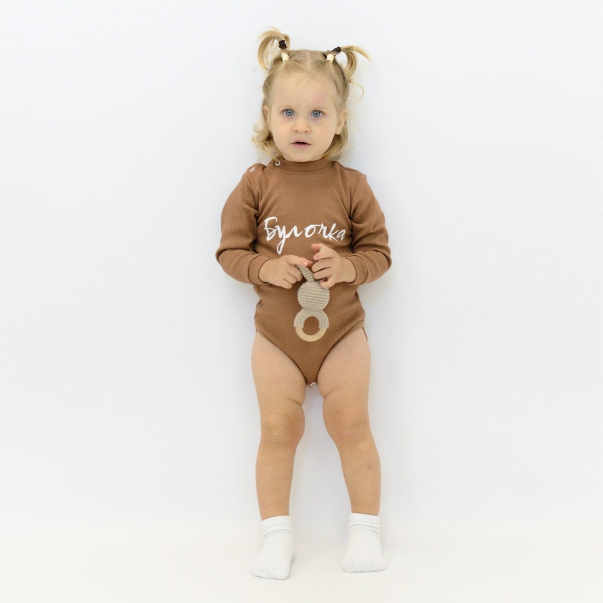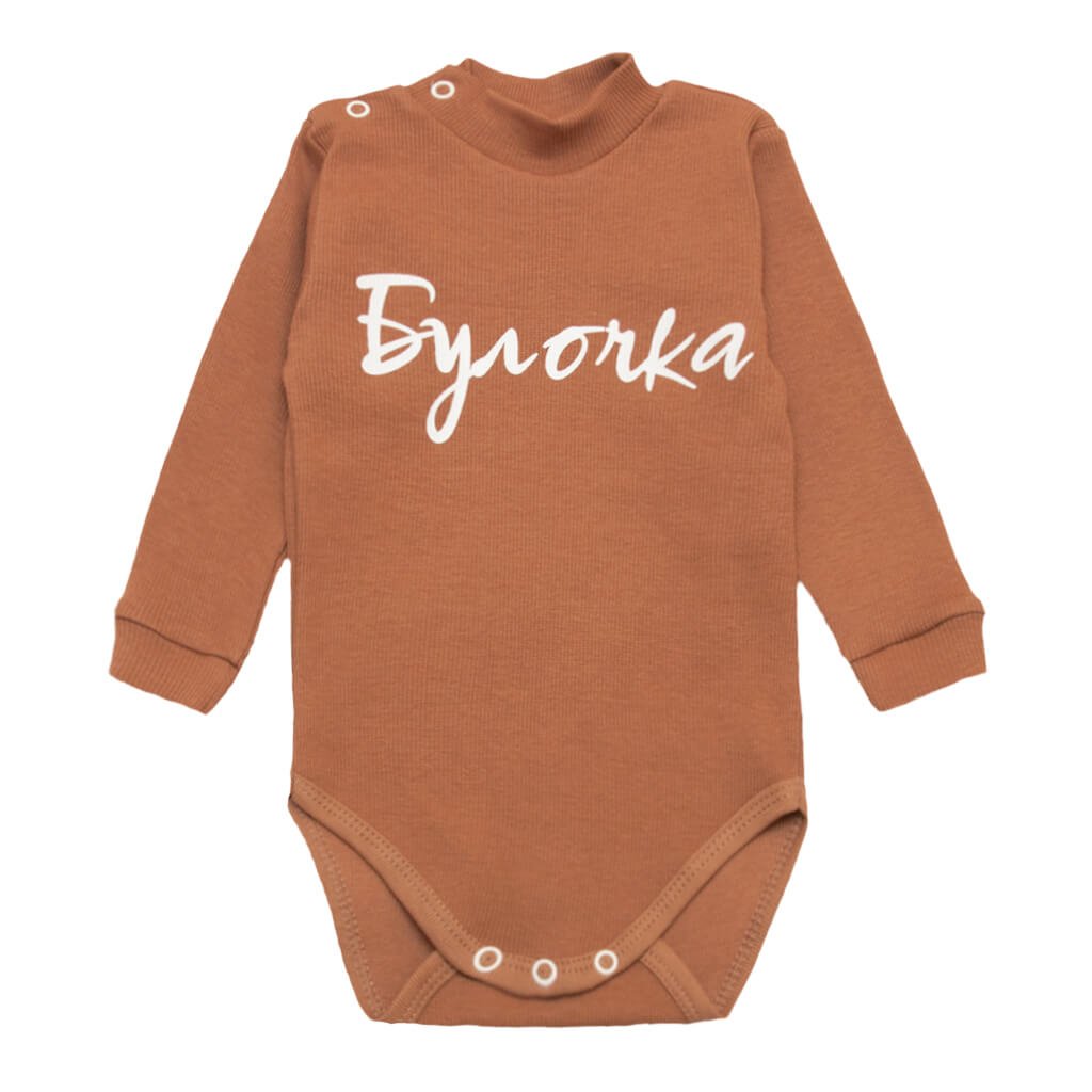 З першого погляду цей боді-гольф викликає відчуття тепла і затишку. Виконаний з м'якого полотна рубчик коричневого кольору з написом Булочка, він дбайливо прилягає до тіла, створюючи комфорт в будь-який час дня. Елегантна горловина-стійка не тільки захищає шию малюка від прохолоди, але і надає виробу акуратний зовнішній вигляд. Зручні кнопки на плечі і між ніжок роблять процес переодягання швидким і легким. На передній частині присутній милий принт, а різноманітність кольорів дозволить вибрати варіант на будь-який смак. Такий боді стане чудовою основою гардеробу малюка і ідеально підійде для щоденного носіння.