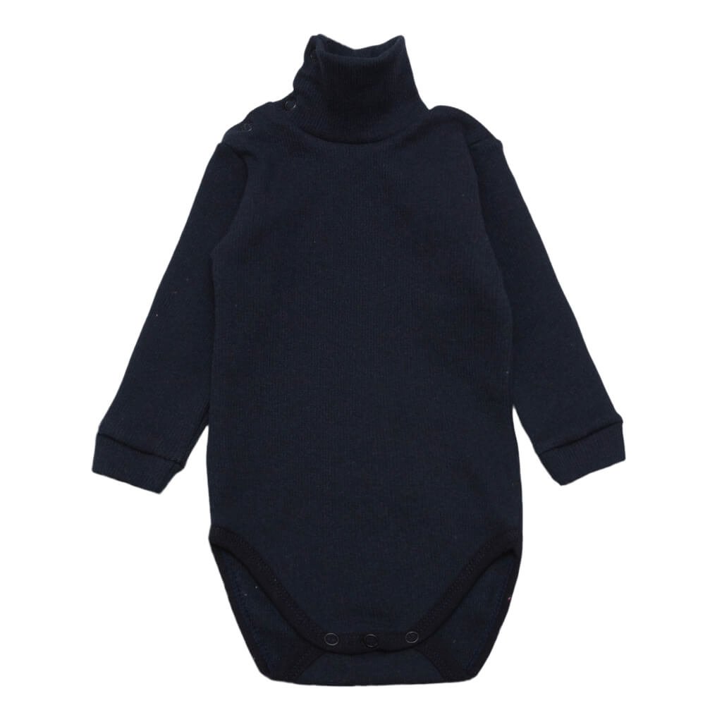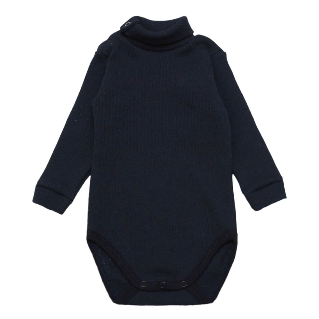 Дитячий боді темно-синього кольору з полотна рубчик з начісним утепленням - ідеальний вибір для холодної пори року. Теплий, м'який і приємний на дотик матеріал забезпечує комфорт малюкові в осінньо-зимовий період. Високе горлечко захищає шию від холоду, що особливо важливо під час прогулянок на свіжому повітрі або в прохолодних приміщеннях. Манжети на рукавах надійно фіксують рукави, запобігаючи їхньому задиранню. Для зручності одягання і переодягання передбачено кнопки на плічках біля горловини. У нижній частині боді також розташовані кнопки, які дають змогу легко змінити підгузок. Боді виконано в класичному стилі з однотонним дизайном, що робить його придатним як для хлопчиків, так і для дівчаток.