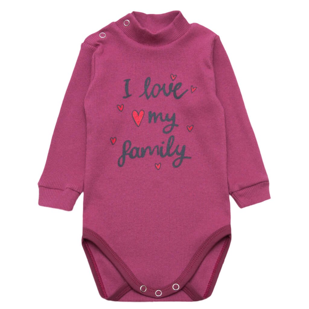Боді-гольф для дівчинки пошитий з якісного рубчикового полотна сливового кольору. Полотно досить щільне, та в той же час еластичне. Виріб добре показує себе під час використання, легко переться та швидко висихає. Горловина-стійка щільно захищає шийку від протягів. На одному плечику є кнопочки, це дуже спрощує та прискорює переодягання малюка. В нижній частині бодік також застібається на кнопки. На рукавах манжети з основного полотна. Прикрасою боді служить милий принт з надписом I love family. У такому боді-гольфі Вашому хлопчику буде тепло та комфортно.